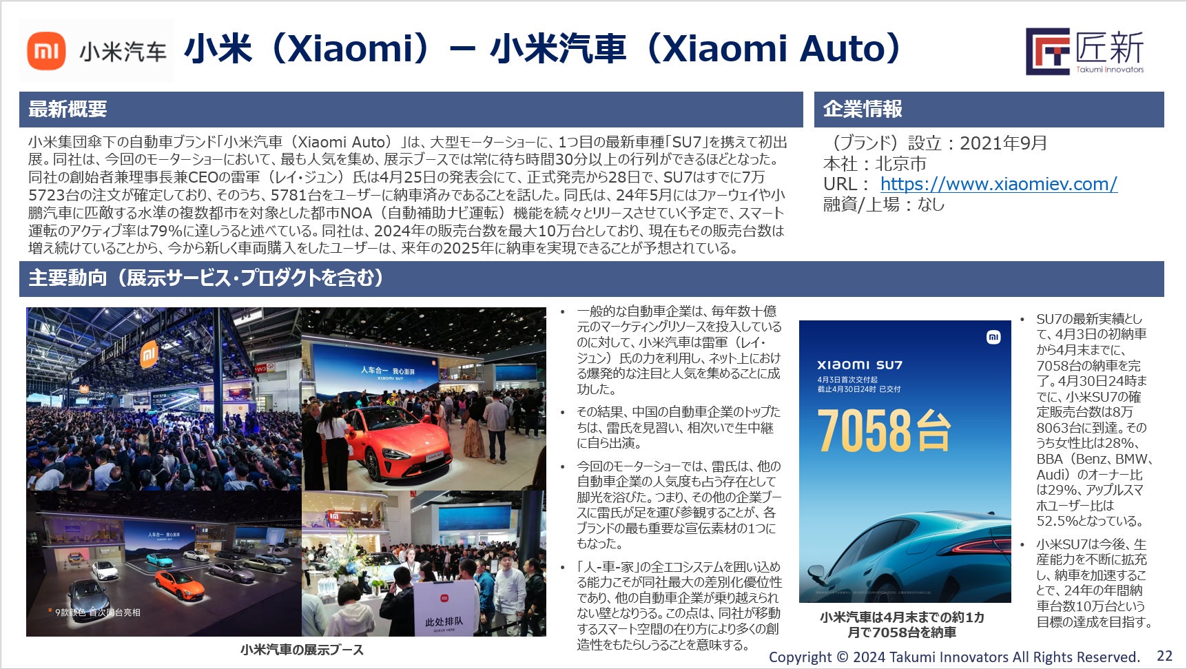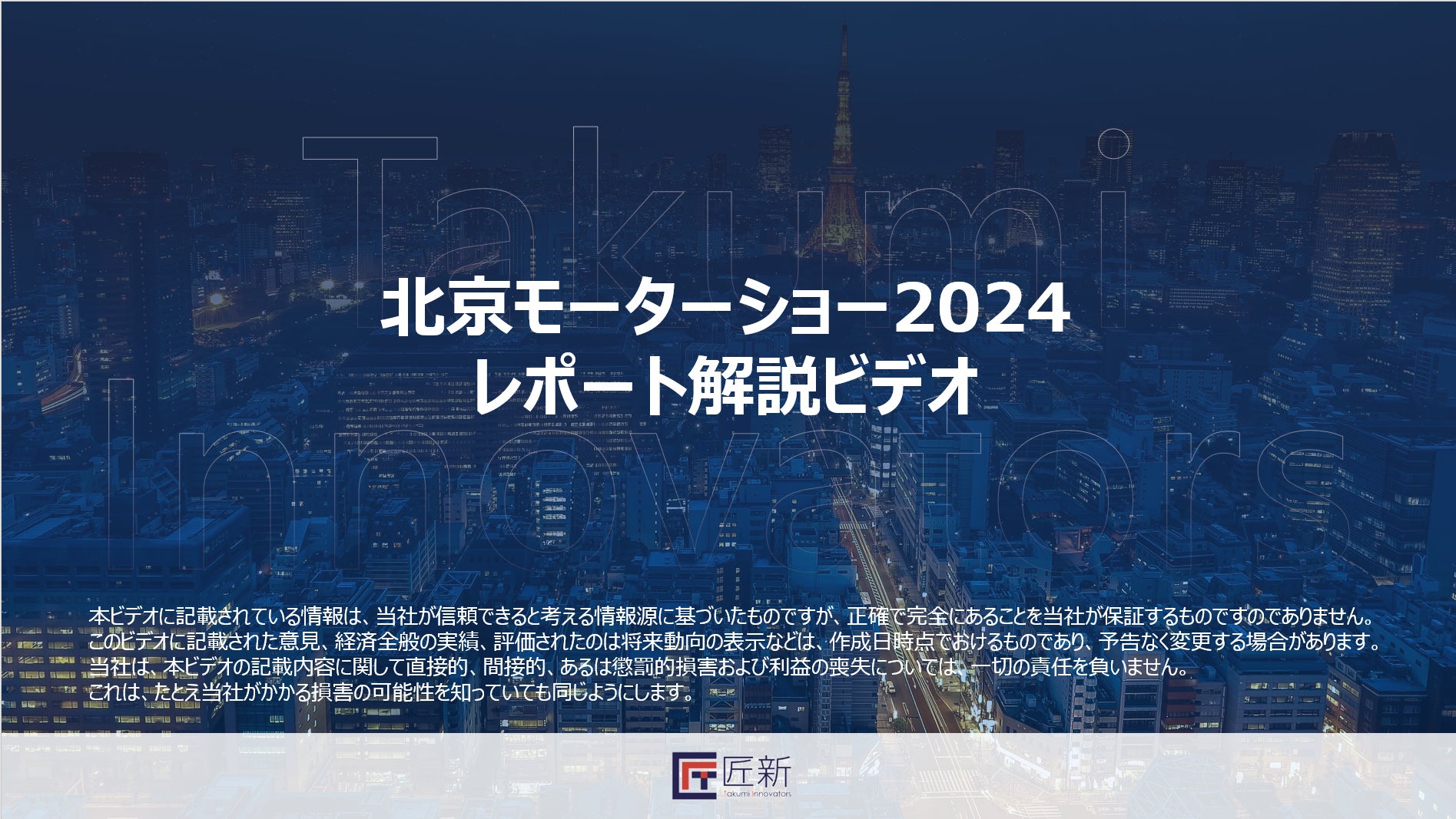 2024年4月25日から5月4日にかけて行われた「北京モーターショー2024」。今回は、その独自レポートを匠新が作成し、無料でご提供。イベントの基本情報から、中国自動車最新トレンド、新勢力ブランドやBATH+αといった出展企業の分析までをカバーしております。ご興味のある方は、ぜひご覧ください。