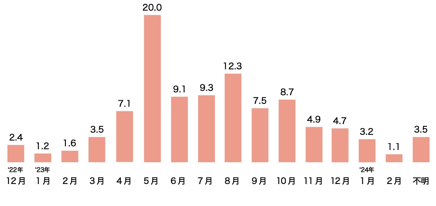 また同調査によると、ランドセルの購入時期としては5月が最も多く20%、次いで8月の12.3%となっています。