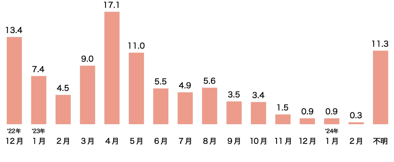 ランドセル工業会が実施した「ランドセル購入に関する調査2024年」によると、購入したランドセルの検討開始時期は2023年の4月が17.1%と最も多く、次いで2022年12月の13.4%となっています。新年度を迎える4月が最も多いですが、年中さんの年末に検討を始める方も多いようです。