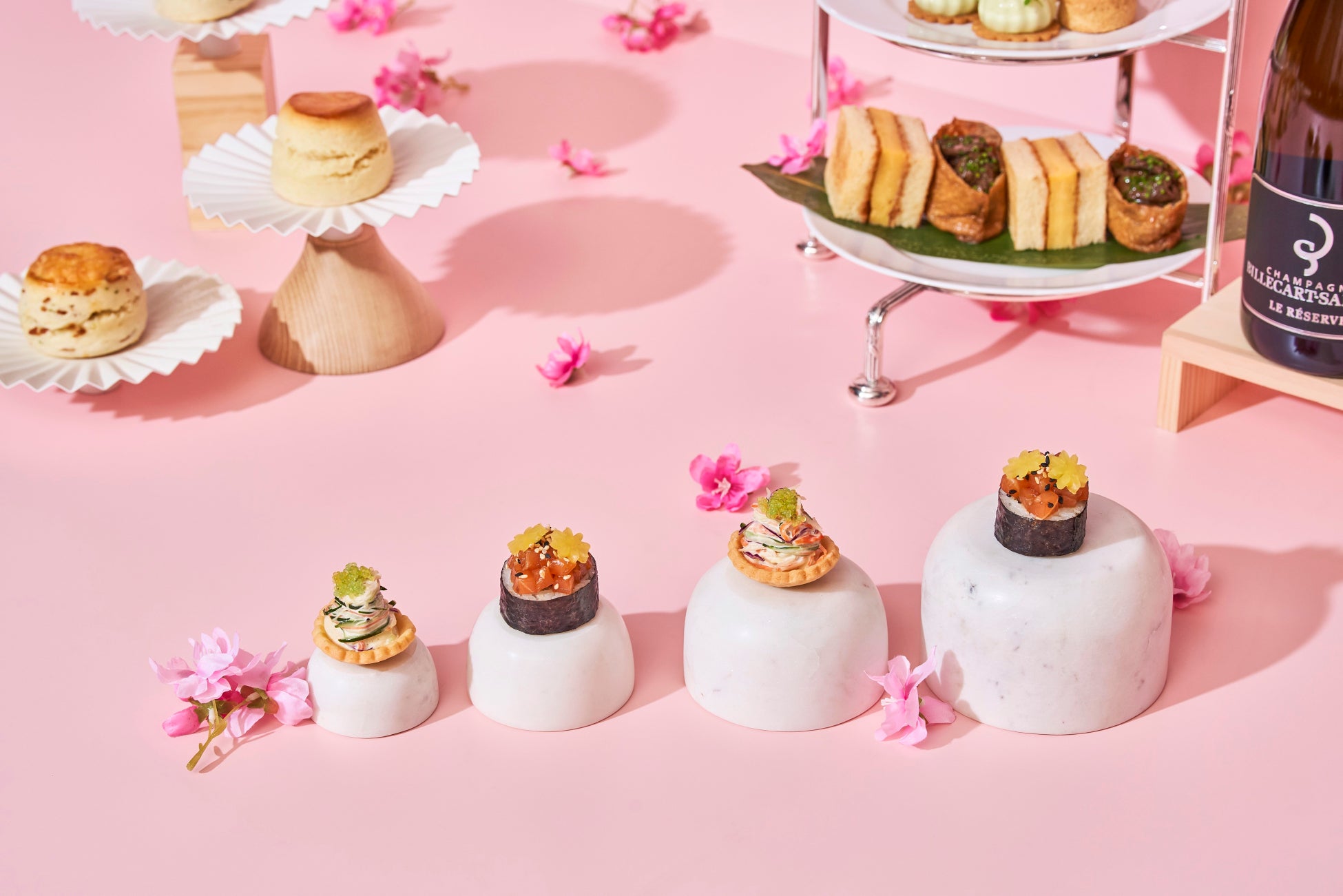 繊細なスイーツを堪能した後は、日本のエッセンスを取り入れた料理をご用意しています。とびっこ入りカニサラダタルト、ビーフ照り焼きのいなりずし、サーモンアボカドロールなど、人気の寿司アレンジに加え、伝統的なだし巻き卵に少しのひねりを加えたシェフオリジナルの玉子焼きサンドをご提供します。