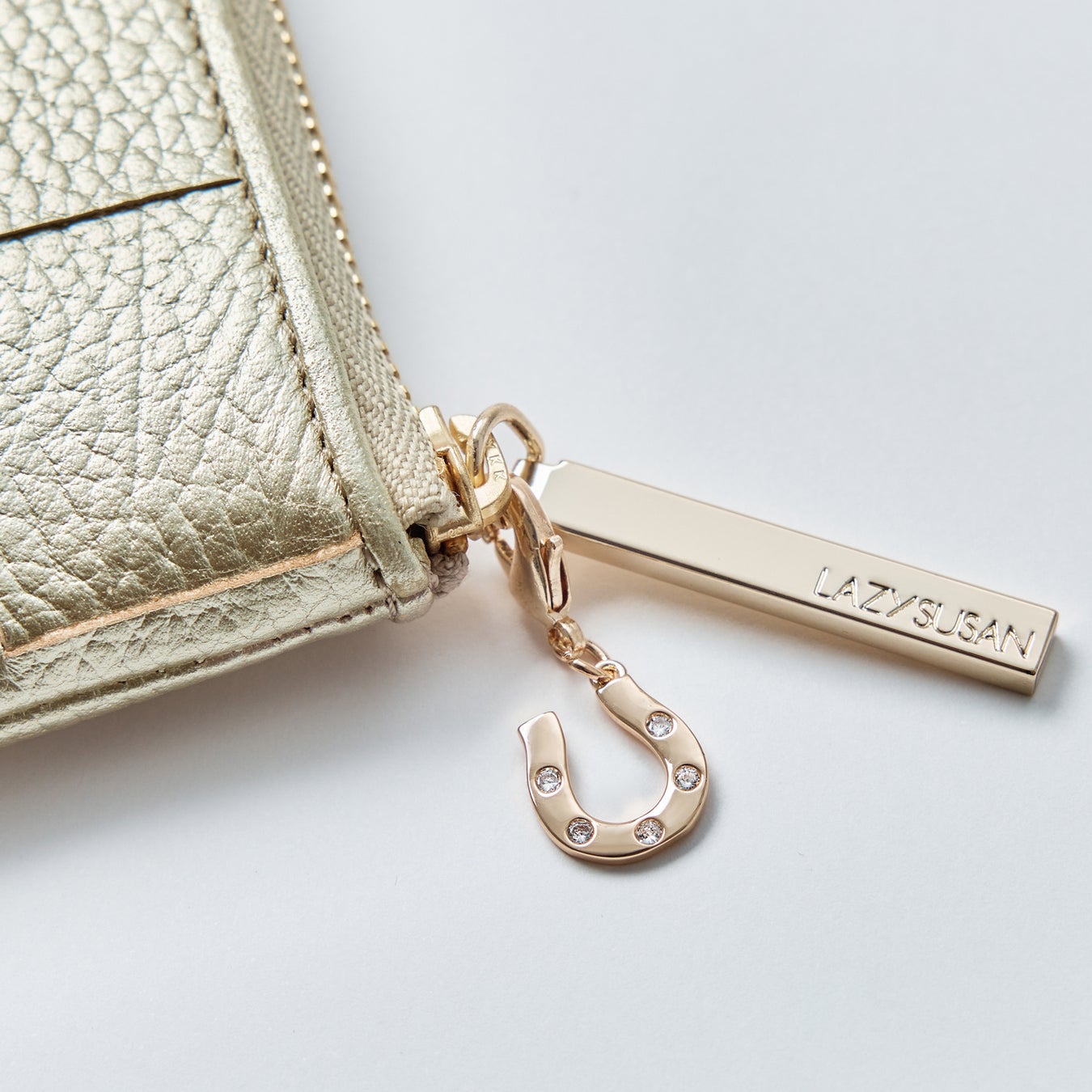 お財布には、幸運を呼ぶラッキーモチーフ「馬蹄」のチャーム付き。馬蹄の釘は勝利と幸運を象徴し、U型が上向きのときは幸運を受け止め、下向きのときは幸運が降り注ぐ意味が。富をもたらすという言い伝えから、金運アップのお守りとして愛されています。