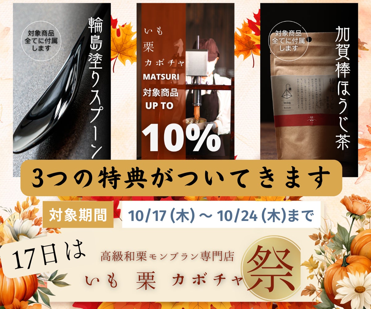 石川県の高級和栗モンブラン専門店「いも栗カボチャ」(本社:石川県小松市清六町205、代表取締役:山本 哲男、以下「いも栗カボチャ」)は、2024年10月17日(木)から24日(木)まで、「いも栗カボチャ祭」を期間限定で開催いたします。昨年「おとりよせ大賞1位」に輝いた当店の人気商品が、3つの特典とともに楽しめるこの機会をぜひお見逃しなく!
