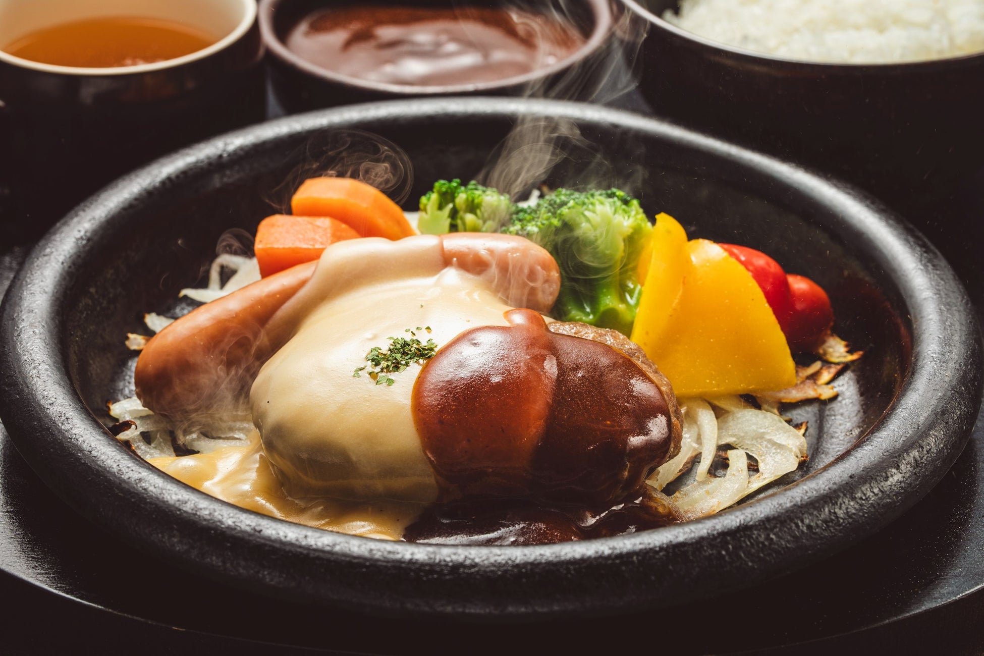 デミグラスハンバーグに、4種類のとろけるチーズのまろやかさと肉の旨みが絶妙にマッチした、リッチな味わいを楽しめます。