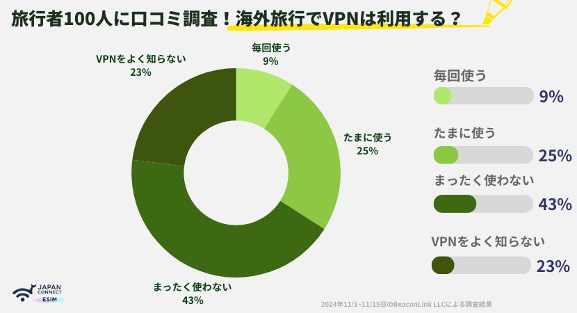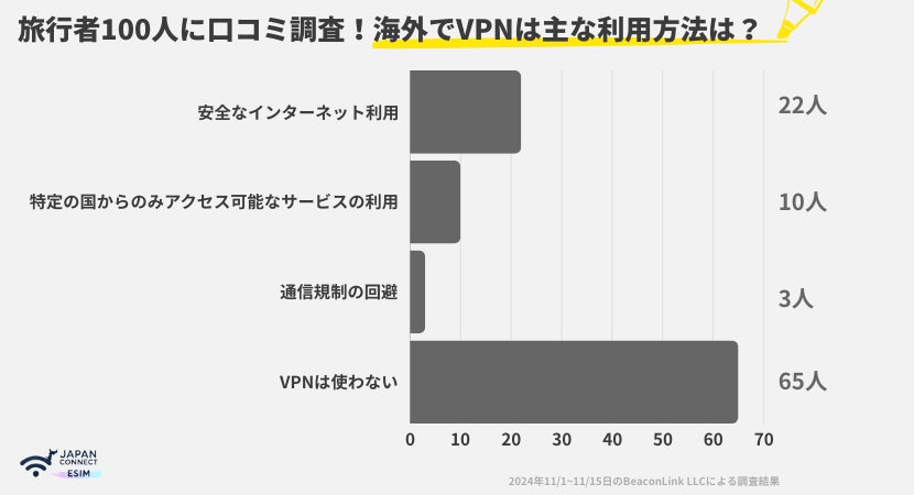 BeaconLink LLC(本社:東京都日野市、代表:阿部 宏貴)は、VPNサービスの比較に役立つ最新情報をお届けするメディア「VPNストリーム」において、海外旅行におけるVPNの利用に関するアンケート調査を100人に実施しました。