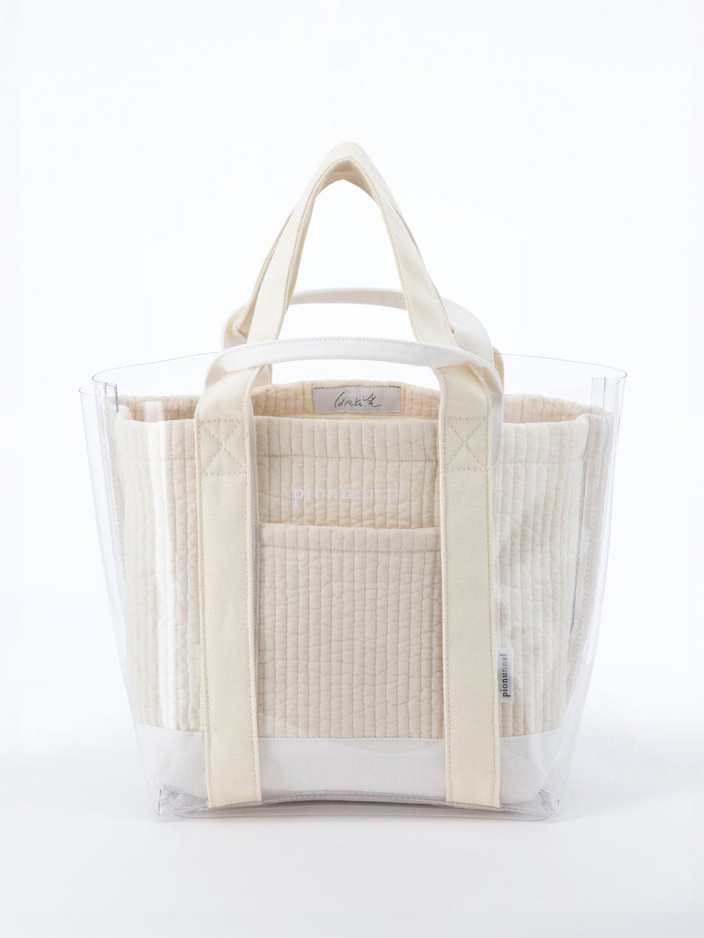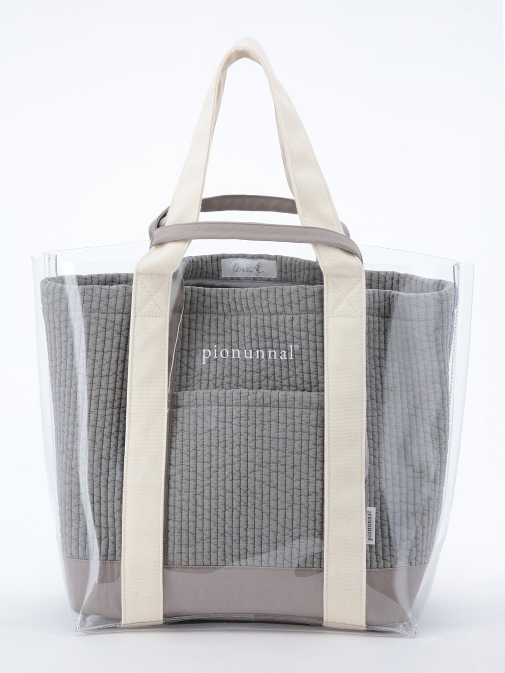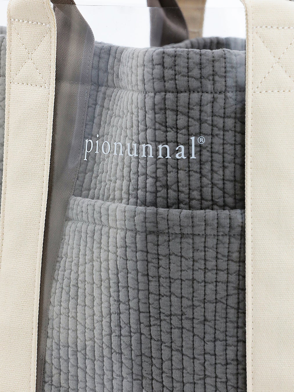pionunnalのロゴが入ったPVCのみの単体持ち、外側ポケット付きのヌビバッグの単体持ち、ヌビバッグをインした3wayの使い方が出来ます。