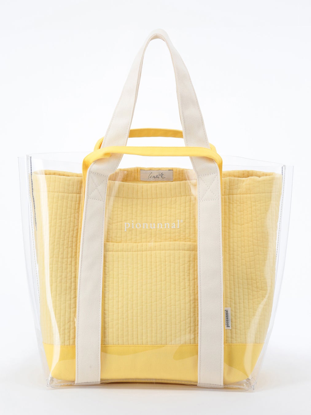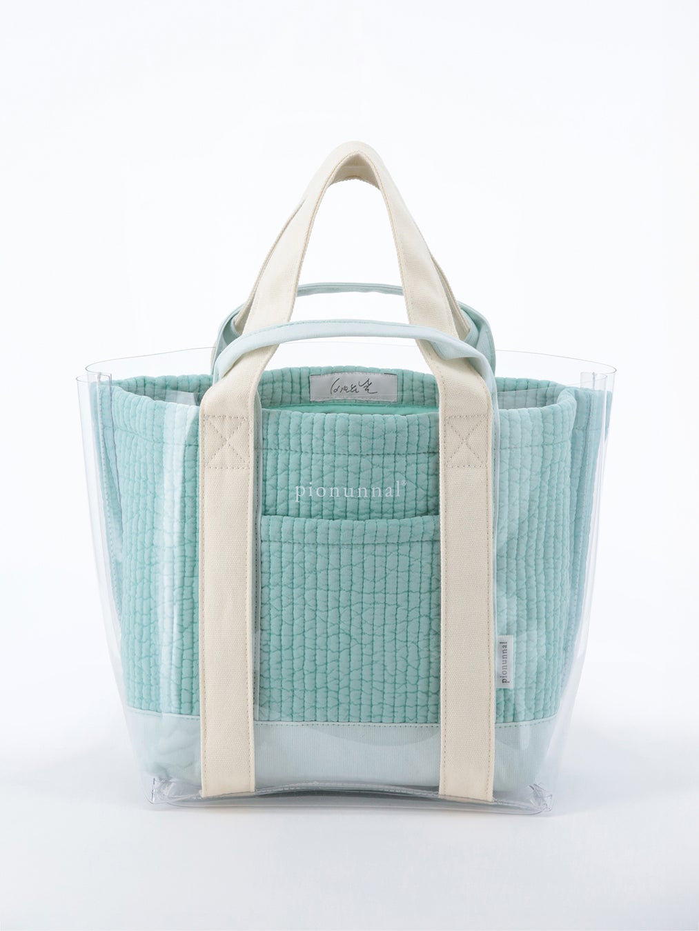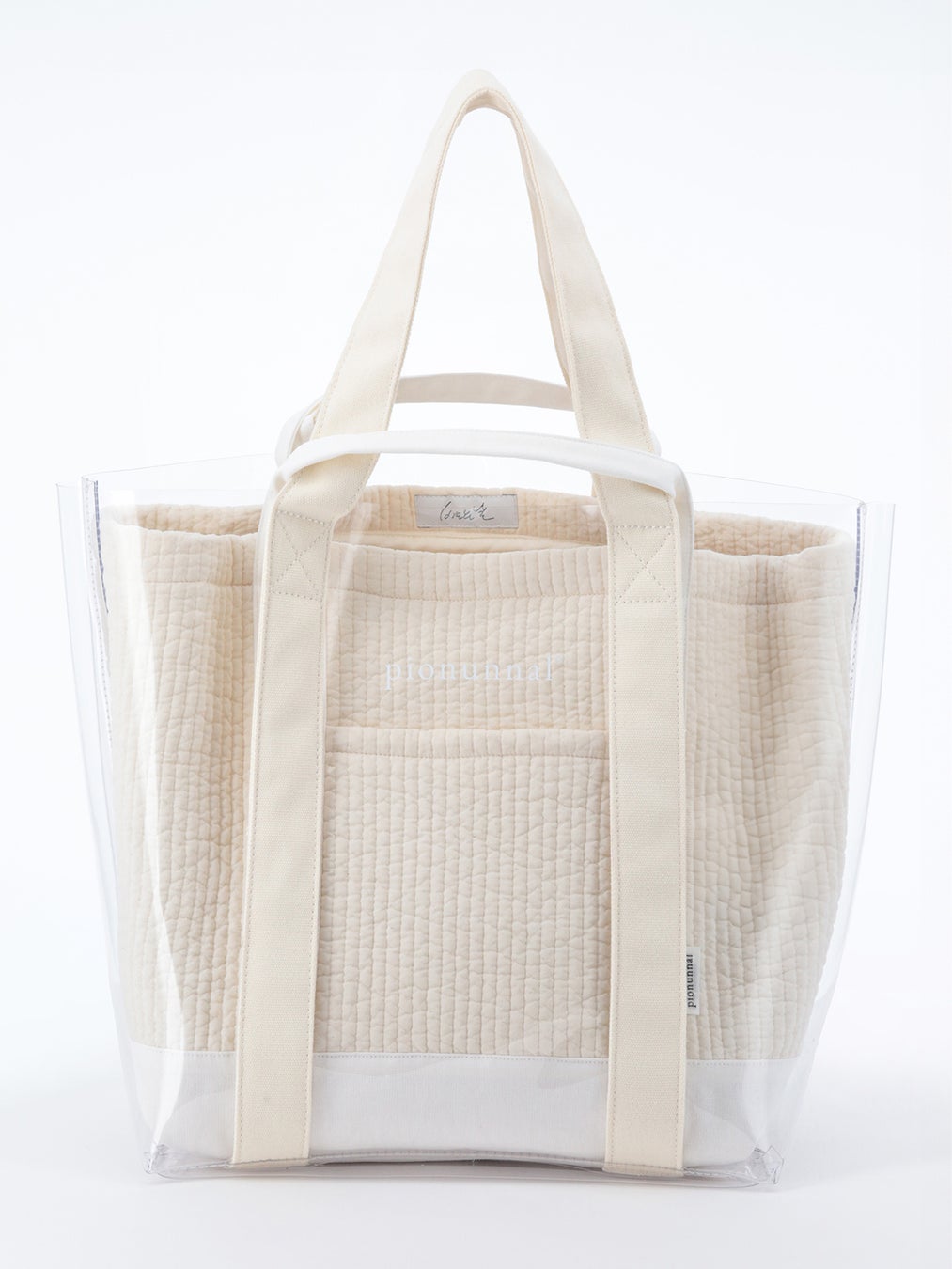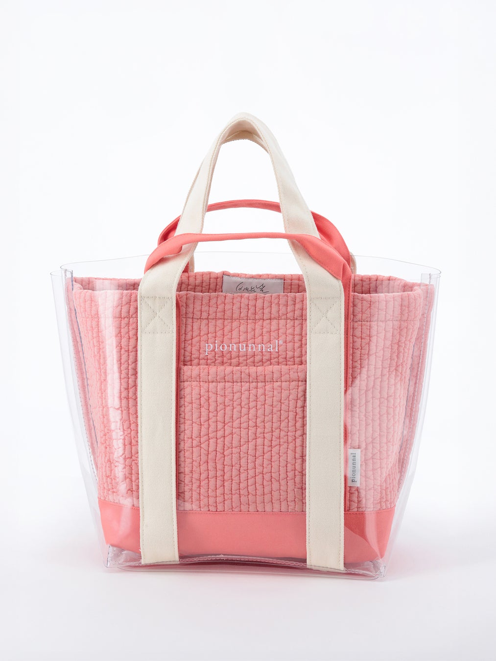 pionunnalのロゴが入ったPVCのみの単体持ち、外側ポケット付きのヌビバッグの単体持ち、ヌビバッグをインした3wayの使い方が出来ます。