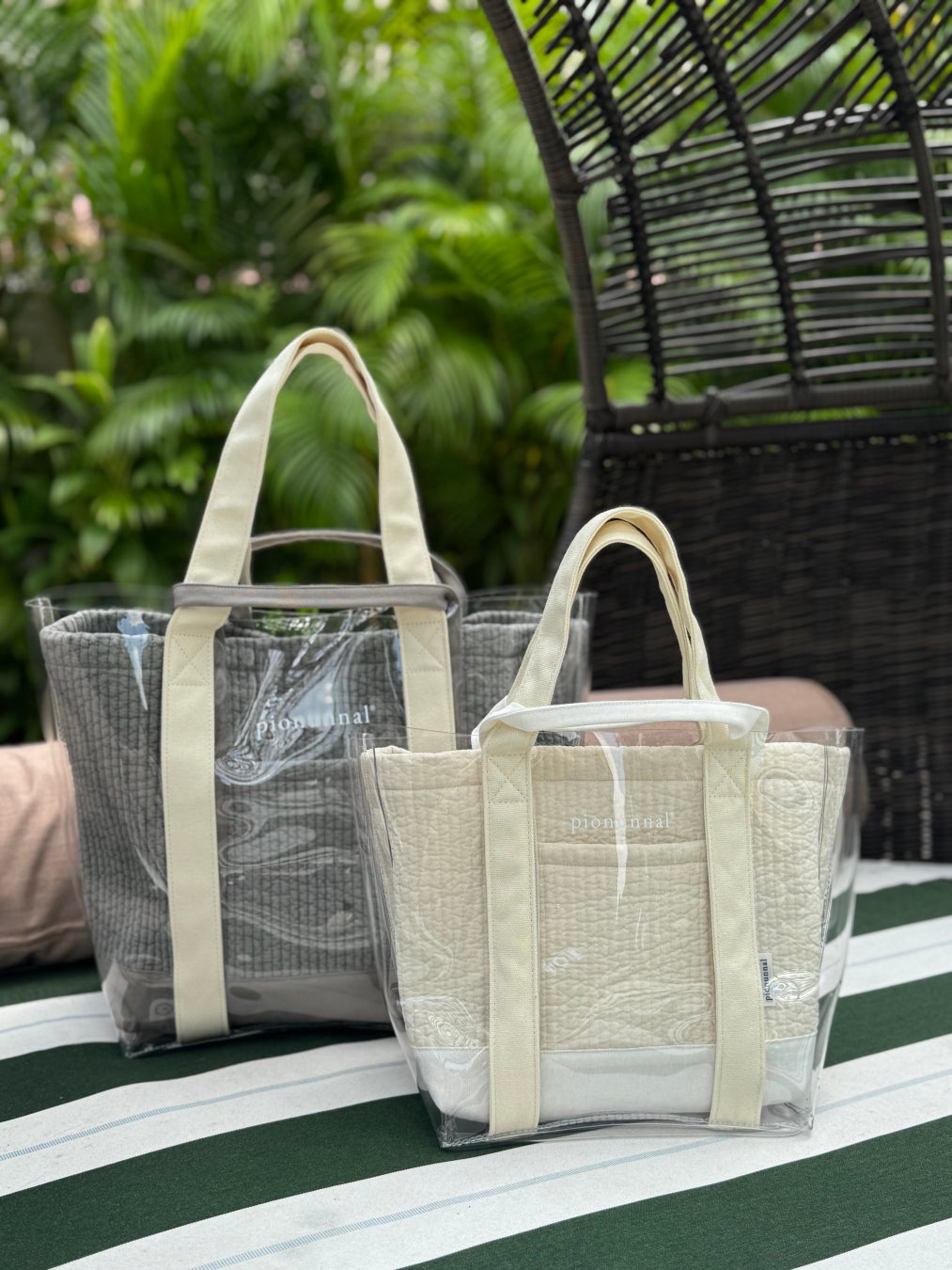 PVCバッグとヌビバッグの2つがSETになっていて、雨の日の仕事用バッグにも、子供のアクティビティにも持っていきやすいシンプルな“プールバッグの進化系”と考えて製作しました。