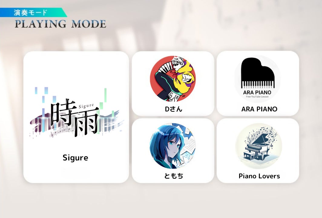 以上、4名のピアノ楽譜YouTuberと提携し、VRピアノゲーム「Sigure」のアプリ内で、音楽ゲームとしてプレイすることができます。
