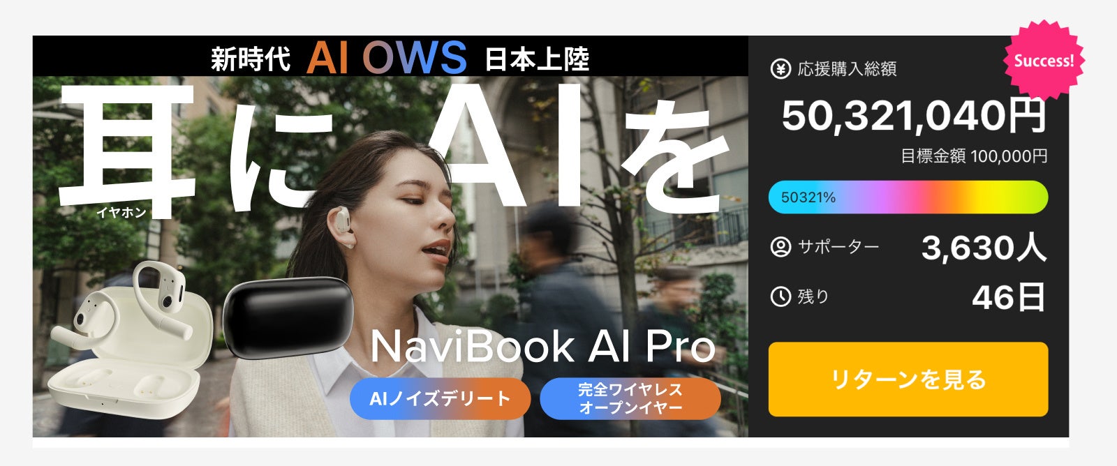 Makuakeにて応援金額5,000万円突破!OWS+AI完全ワイヤレス・オープンイヤー型イヤホン「NaviBook AI Pro」!