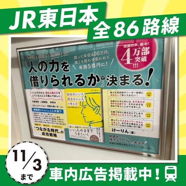 この書籍をより多くの方々に認知いただきたく、交通広告を展開いたしました。10月28日(月)から11月3日(日)までの間、JR東日本の全86路線の全車両において、ドア横ポスターでの車内広告が掲載されます。多くの方の目に触れていただけることを大変嬉しく思います。
