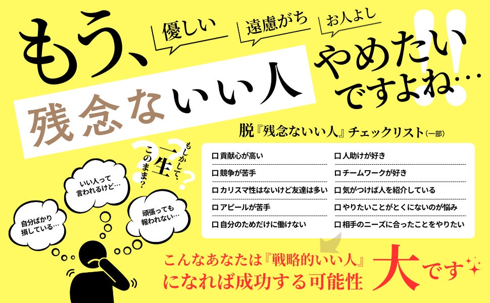 年代問わず多くの方に手に取っていただき、5万部を突破したこととても嬉しく思います。“いい人”と言われるのに自分ばかり損をしている。頑張っても報われない…。優しい、遠慮がち、お人好し。そんな “残念ないい人”として損してきた私も視点を変えたら“いい人”のままでうまくいき、法人2期目で年商5億円の会社に成長しました。