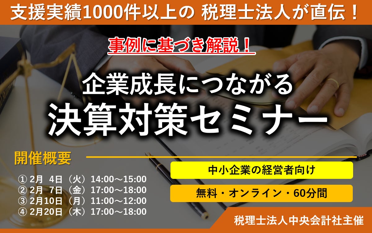 経理代行に強い税理士法人中央会計社(本店所在地:愛知県豊橋市)は、「企業成長につながる!決算対策」を解説する無料セミナーを2025年2月に全4回開催いたします。