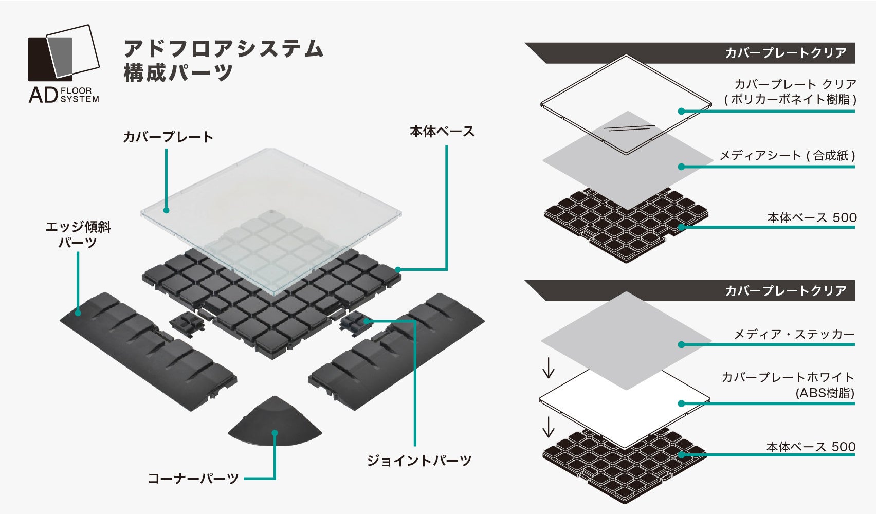 本体ベースとカバープレートの間、もしくはカバープレート上面に印刷メディアをセットすることで、床面を広告スペースとして有効活用。イベントや展示会での注目度アップにつながります。