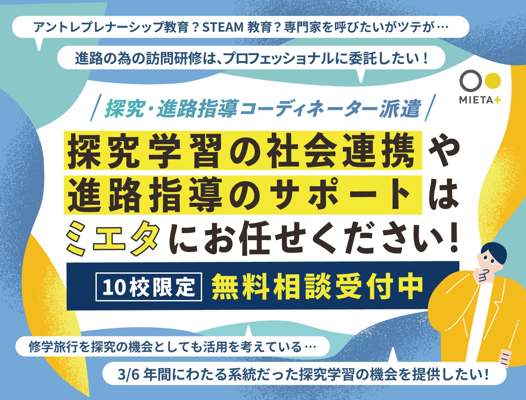 株式会社ミエタ(東京都港区、代表取締役:村松知明、以下ミエタ)は、学校現場における探究的な学びに関する授業カリキュラムの策定サポートや、進路指導の支援員を派遣する「探究・進路指導コーディネーター派遣事業」を2025年度より本格展開いたします。