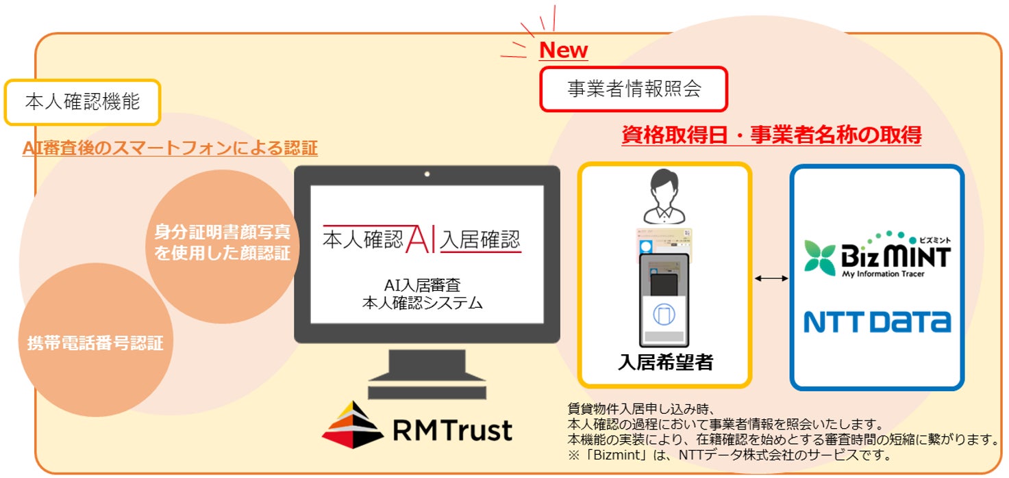 アールエムトラスト株式会社(本社:東京都中央区 代表取締役:松島億 以下「当社」)は、2024年12月2日から施行される健康保険証の運用切り替えに伴い、入居審査時に必要としていた健康保険証を用いる従来の運用を変更する方針に決定いたしました。運用の変更にあたり、事業者情報を取得することで、入居審査の過程の一つである在籍確認の実施を省略し、入居審査全体の時間短縮が期待できる点に着目。新運用の実現のため、株式会社NTTデータ(以下「NTTデータ」)が提供する「BizMINT ®」と連携し、事業者情報を取得できるシステムの開発に向けた検討を開始いたしました。