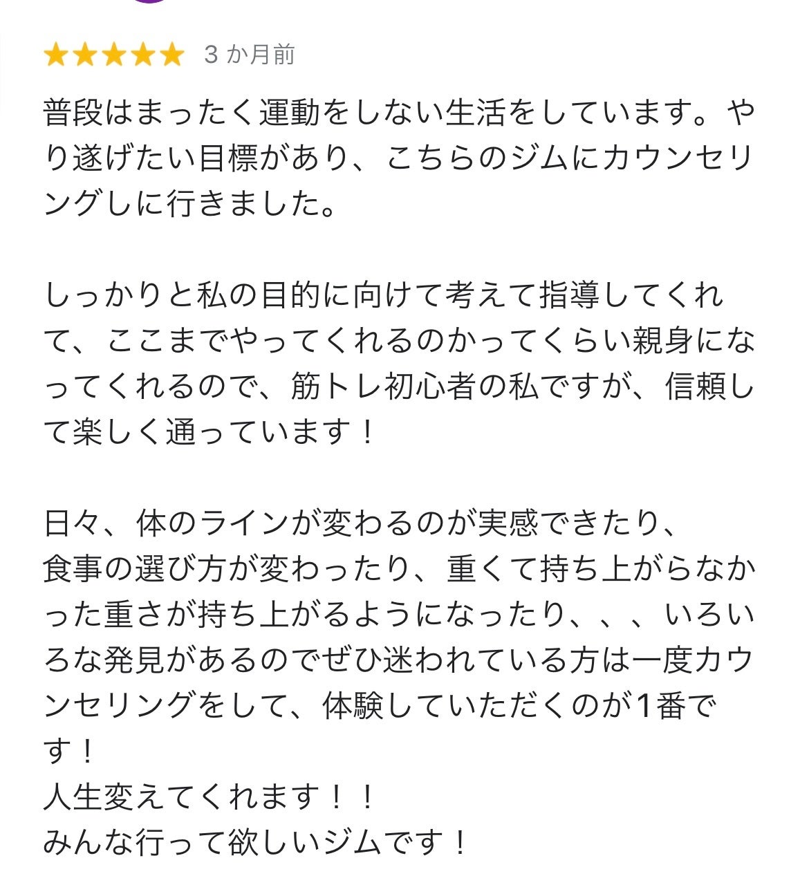 しっかりと私の目的に向けて考えて指導してくれて、ここまでやってくれるのかってくらい親身になってくれるので、筋トレ初心者の私ですが、信頼して楽しく通っています!