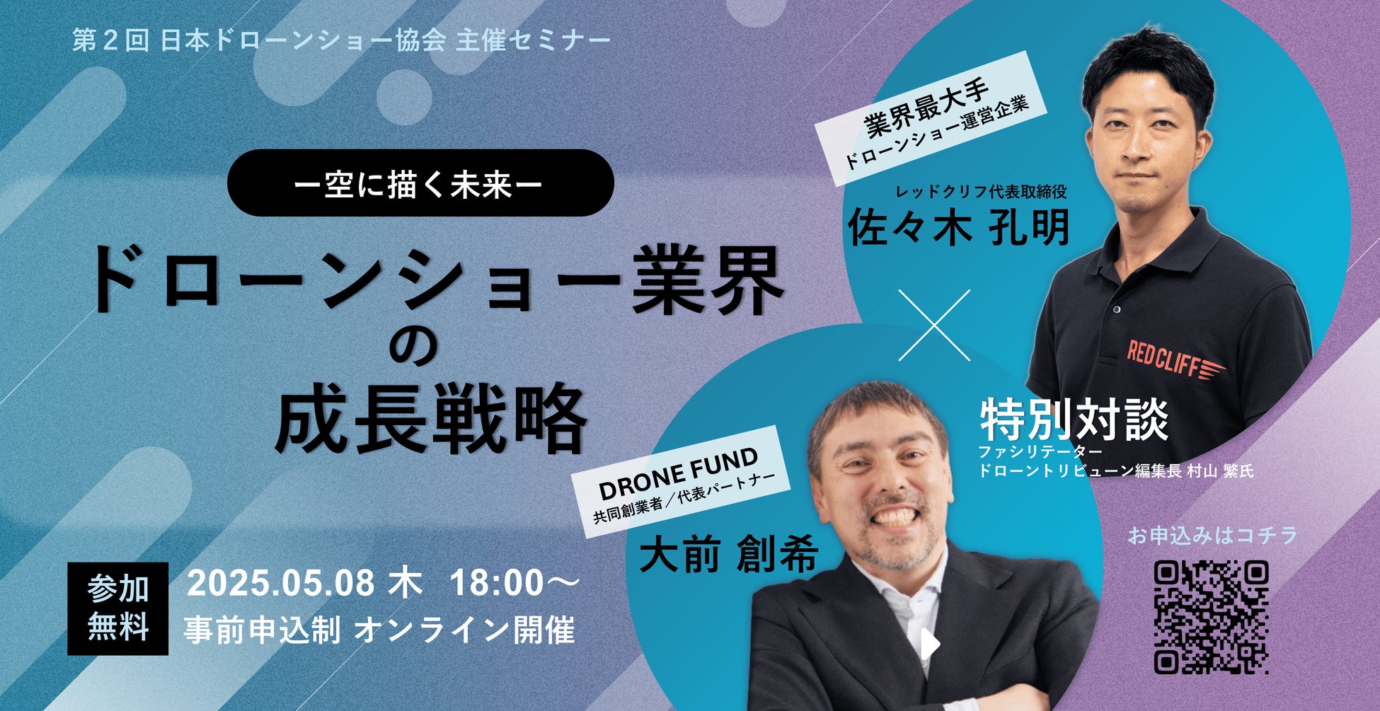一般社団法人 日本ドローンショー協会(所在地:東京都港区、代表理事:佐々木 孔明、以下「日本ドローンショー協会」)は、2025年5月8日(木)に特別ウェビナー「空に描く未来|ドローンショー業界の成長戦略」を開催します。