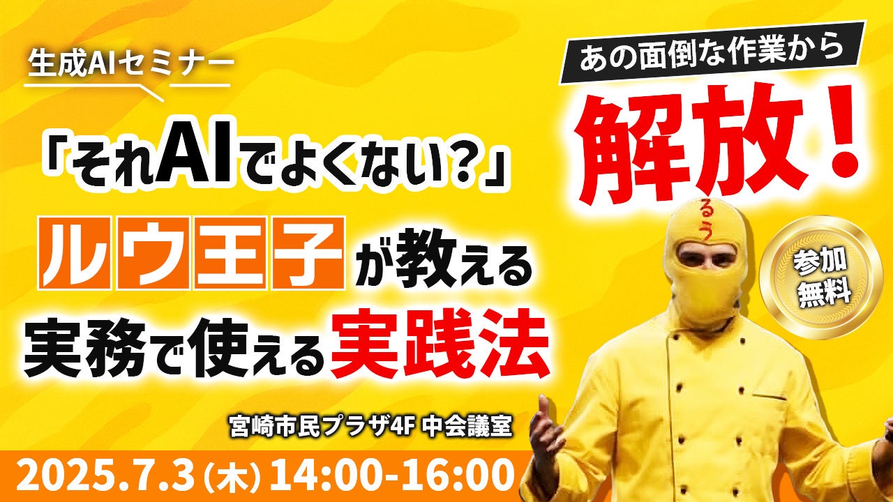株式会社アスカゼ(宮崎県宮崎市、代表取締役:田中宏樹)は、2025年7月3日(木)に宮崎市民プラザ にて、AI活用セミナー「それAIでよくない?」ルウ王子が教える!実務で使える実践法を無料にて開催いたします。