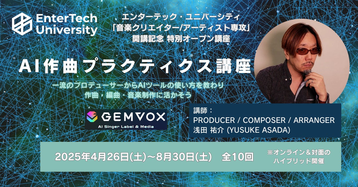 また、特別オープン講座として、日本で最もテクノロジーに長けた音楽プロデューサーであり、一般社団法人 日本シンセサイザープロフェッショナルアーツ(JSPA)代表理事でもある浅田 祐介 氏による「AI作曲プラクティス講座」も開催いたします。本オープン講座は、エンターテック・ユニバーシティの学生だけでなく、AI作曲について本格的に学びたい方は、どなたでも受講可能です。