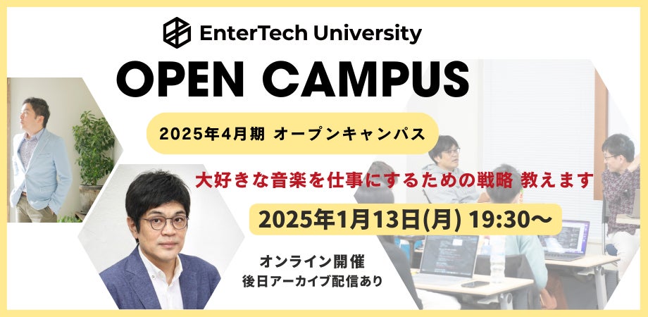 音楽業界が創った、音楽業界の就職・キャリアに1番近いオンラインスクール「エンターテック・ユニバーシティ」を運営するエンターテックエデュケーション株式会社(本社:渋谷区、代表取締役:山口 哲一)は、2025年4月より「音楽ビジネス専攻(1年制)第二期」に加え、「音楽クリエイター/アーティスト専攻(1年制)第一期」を開講いたします。ただいま受講生を募集中です。