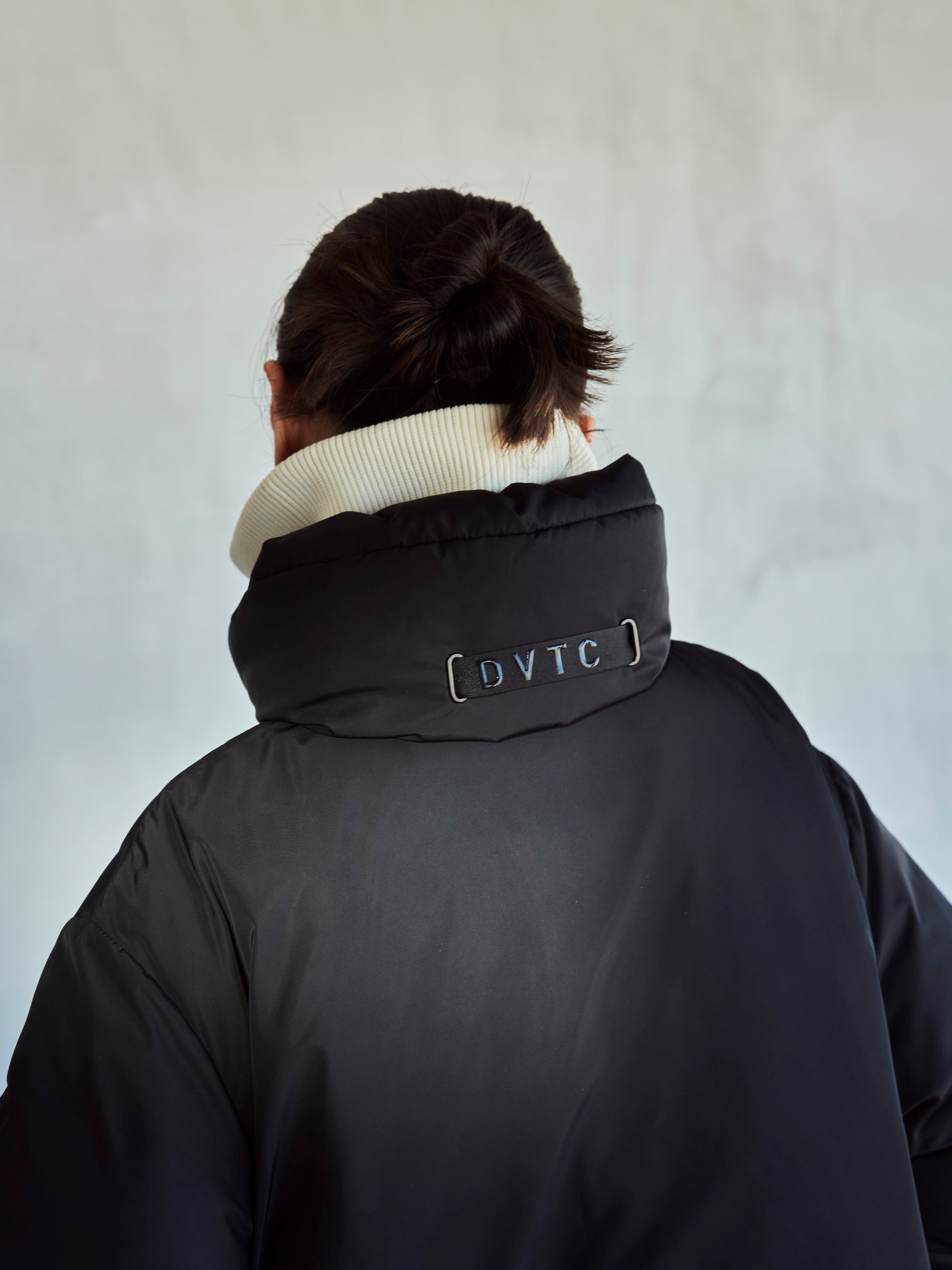 アイコンとなる2本のロゴテープが特徴的なロング丈コートは、重量感を抑え日常的に気軽に羽織れる仕上がりになっています。フロントを開けても様になる襟元と裾のスリット、やや絞った丸みのあるシルエットなど、細部のディテールにもこだわり、防寒性もあり洗練されたデザインです。
