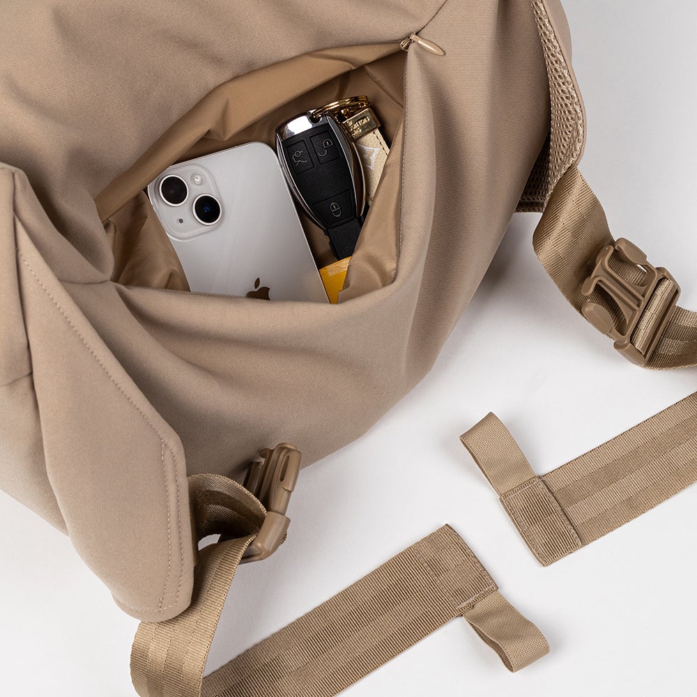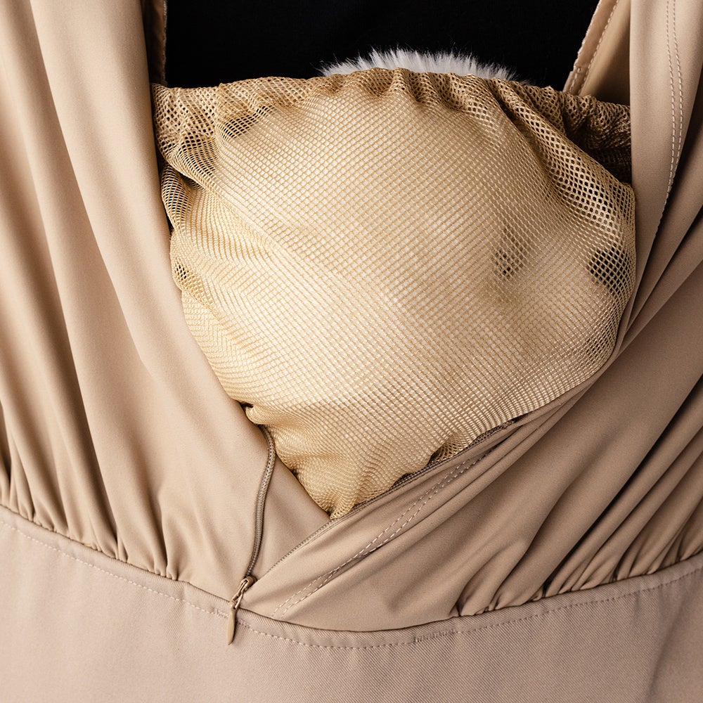 単純な抱っこ紐、スリングのような機能だけでなく、内側ポケットにはペットマナーを守れるネットや、飛び出し防止リードも内蔵されており、外側にはお出かけの際に便利な小物ポケットも付いています。
