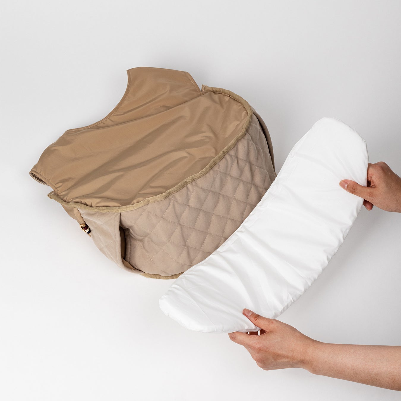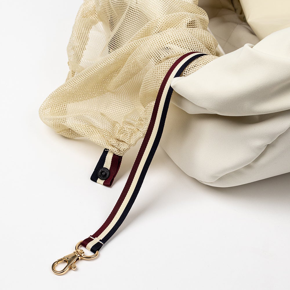 肩ひものギャザー部分は伸縮性のあるスパンデックス生地を使用し楽に動けるだけでなく、背面を支えるパッドの内側は通気性に優れた生地を使用し汗をかいても蒸れにくい素材で製作されています。また、ペットの座る底面の生地は、滑りにくいキルトで仕上げ、ペットがくつろげる空間になるよう幅広で丈夫なサポートパッドが付属されています。