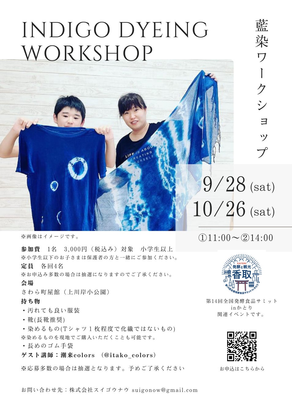 10/26(土)・27(日)に、香取市で開催される「第14回全国発酵食品サミットinかとり」の関連イベントとして、小野川沿いにあるさわら町屋館(香取市上川岸小公園)にて、藍染ワークショップと酒粕で作る生チョコ作りを開催いたします。