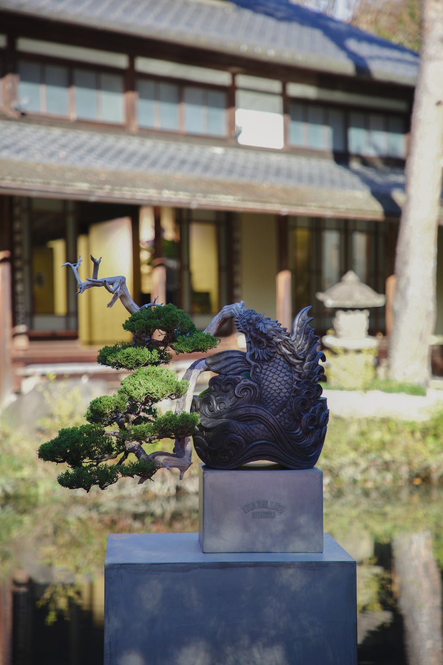 盆栽と瓦鉢が一体化して完成する「盆瓦」の真髄を体現した唯一無二の作品です。斜幹の力強い樹形はドラゴンが天を駆け上がる姿、幹の舎利(白い部分)はドラゴンの胴体を思わせます。盆栽の枝ぶりを細部まで計測し、接続部分を調整する作業は、繊細さと集中力を極限まで要するものでしたが、盆栽と瓦鉢が完全にひとつになる瞬間を表現するという挑戦の軌跡が、壮大な光景を生み出しています。