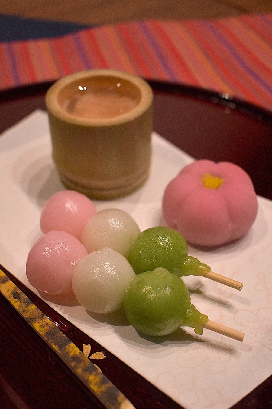 花手水を模した豆乳寒天+桜ジュレ、梅もち、三色だんごを添えた 和デザート。狭山茶付き。