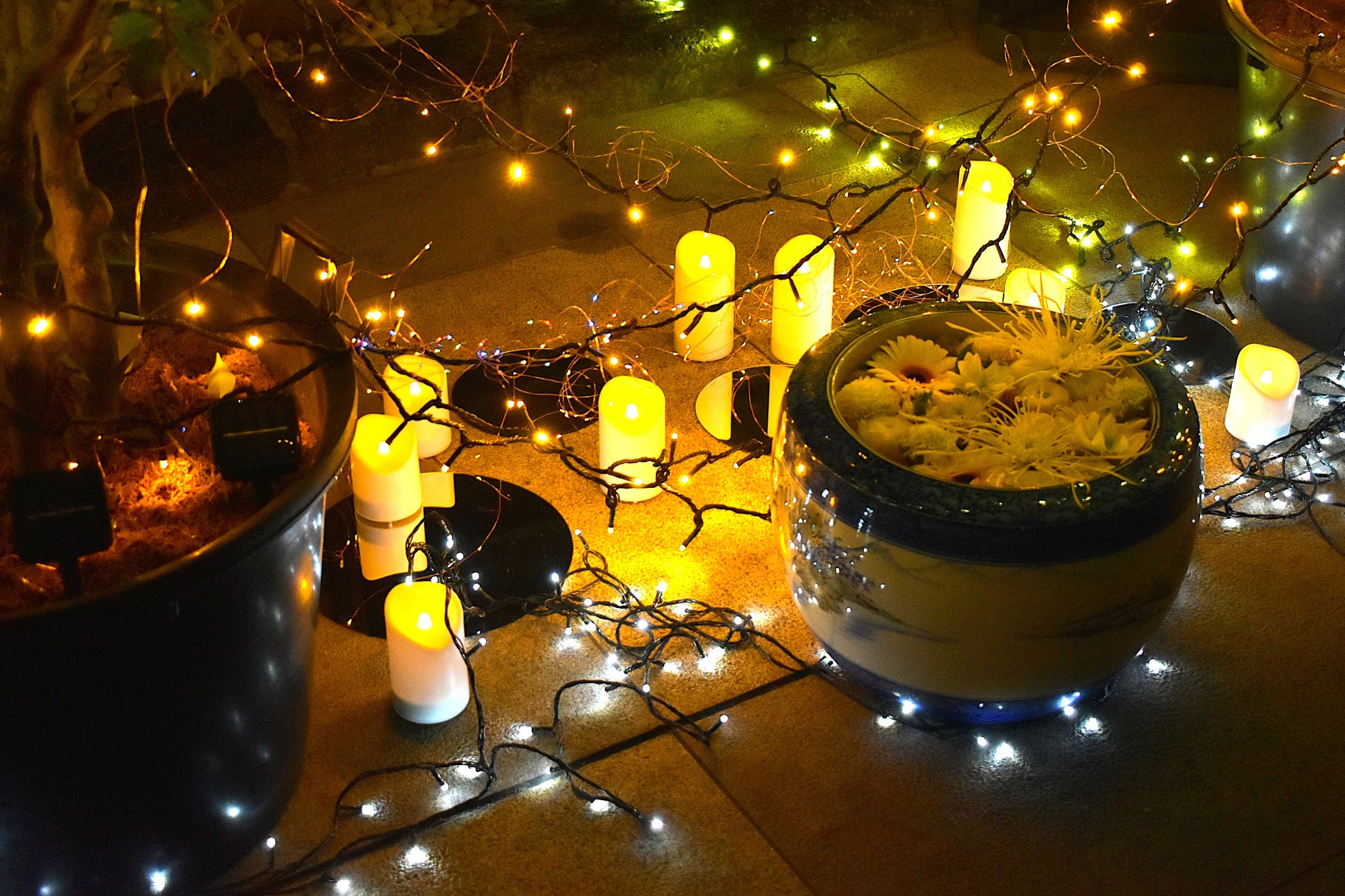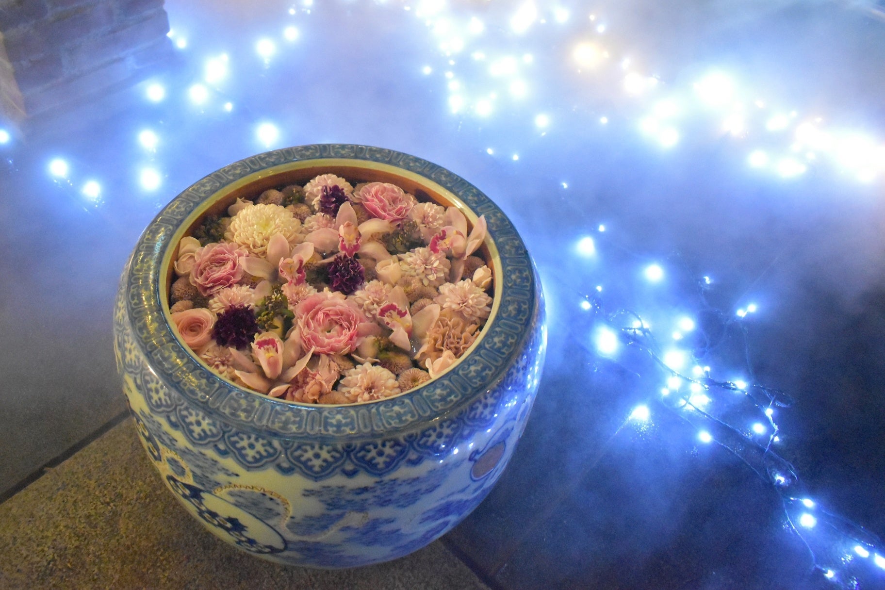 川越で話題の花手水を3か所に設置。花とキャンドル電飾の組み合わせが美しく、昼間でも夜でもフォトジェニックなスポットとして楽しめます。