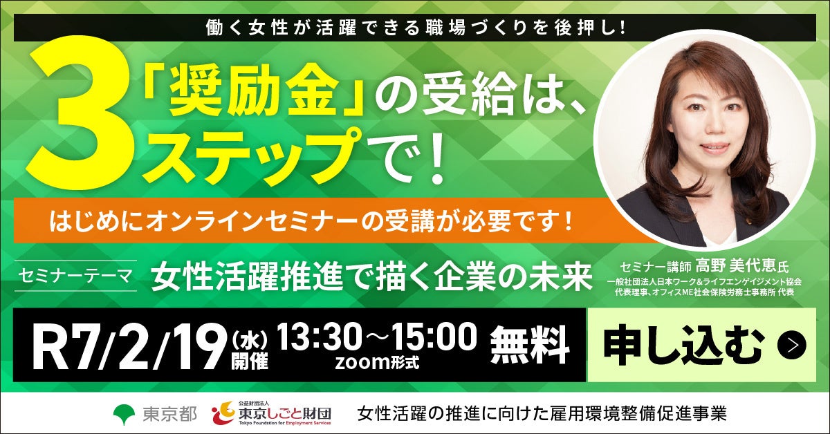 (公財)東京しごと財団では、都内中小企業等で働く女性が活躍できる職場づくりを目指す取組を実施した場合に奨励金を支給します。