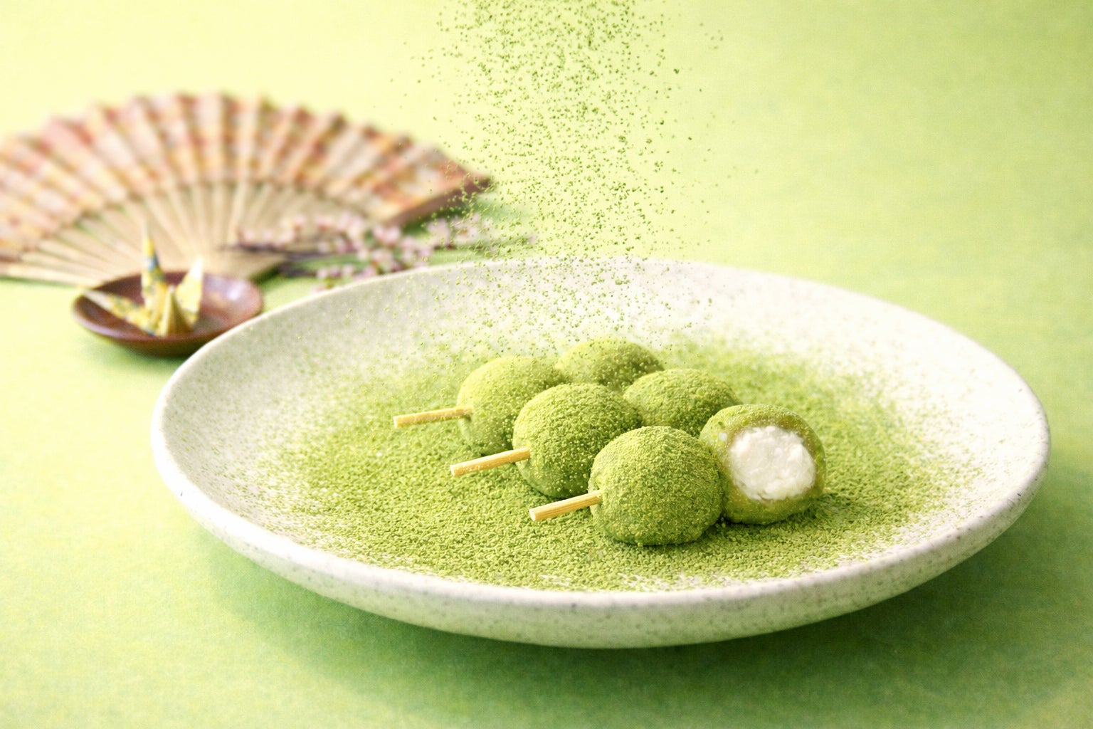 研究により導き出した独自の配合により、餅生地の食感を長く保つことにも成功しています。そのもちもちの餅生地に抹茶粉をふんだんに練りこませており、豊かな風味を感じることができます。さらに外側からも抹茶粉をまぶすことで、中からも外からもより抹茶の風味を感じることができます。