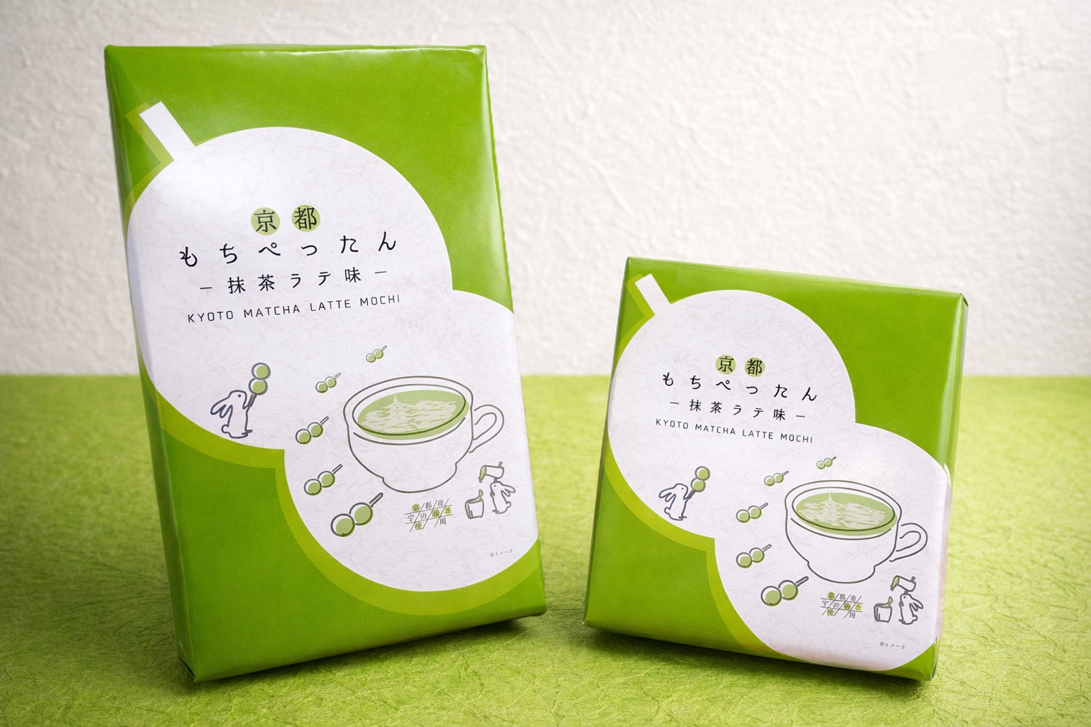 京都といえばお団子、お団子といえばうさぎの餅つき。そんな連想が広まればという想いから商品づくりをスタートしました。その中で、京都で忘れてはならない存在の「抹茶」を使い、より一層広く多くの方に親しんでもらうべく、「みるく」という”洋”の要素も取り入れ、京都の伝統と進化を『抹茶ラテ』という味で表現しました。「抹茶」と「みるく」をイメージした緑と白を基調にし、ラテの中に少し京都の描写を取り入れることで、京都かつ日本らしいお土産にしています。そして、うさぎのつきたてのような、もちもち食感が自慢のだんごをイラストと商品名で表現しています。