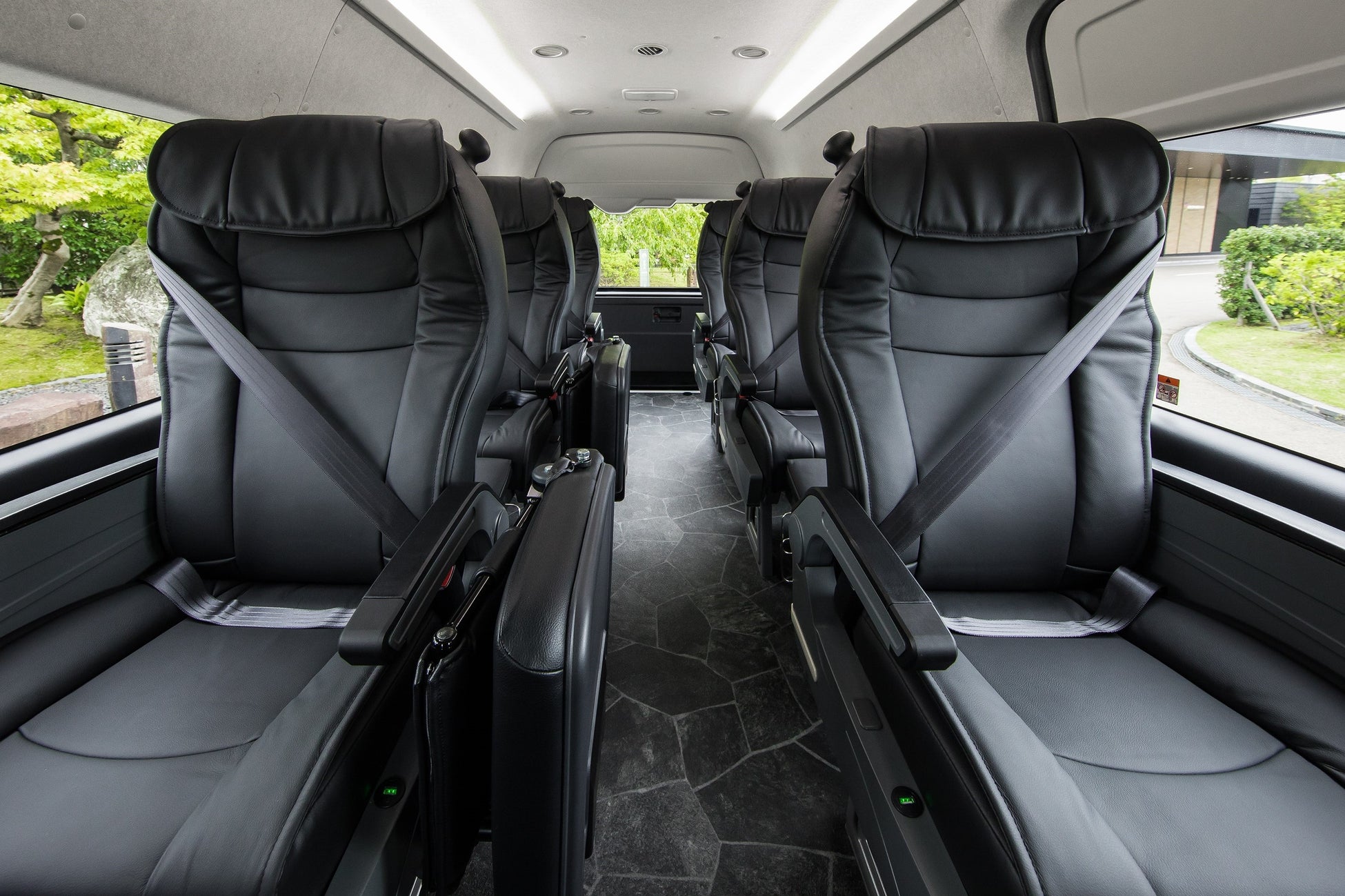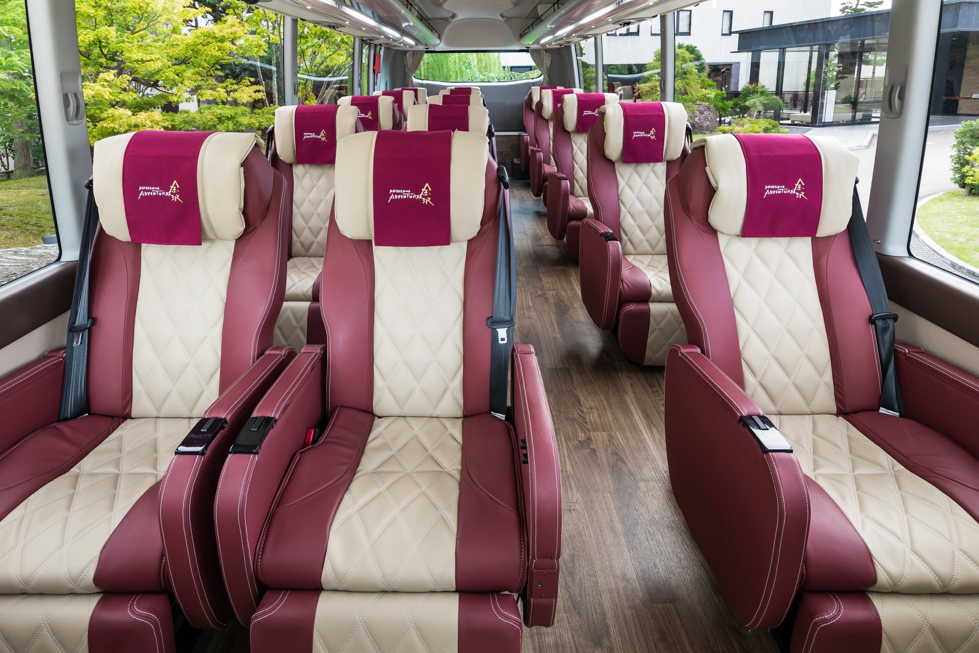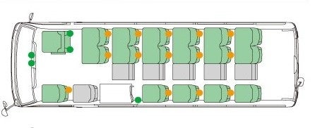中型バスを通常の半分程の15名定員(横3列×縦5列)にすることでゆとりのあるスペースとなり快適