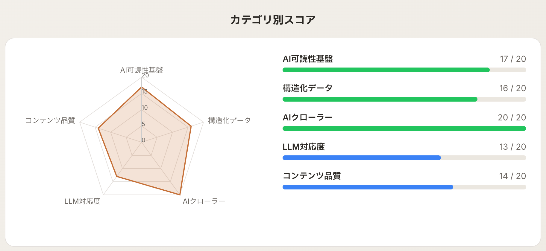5カテゴリ × レーダーチャート — W3C準拠度、Schema.org実装度、AIクローラー許可状況、llms.txt対応度、コンテンツ品質の5軸でサイト全体を可視化