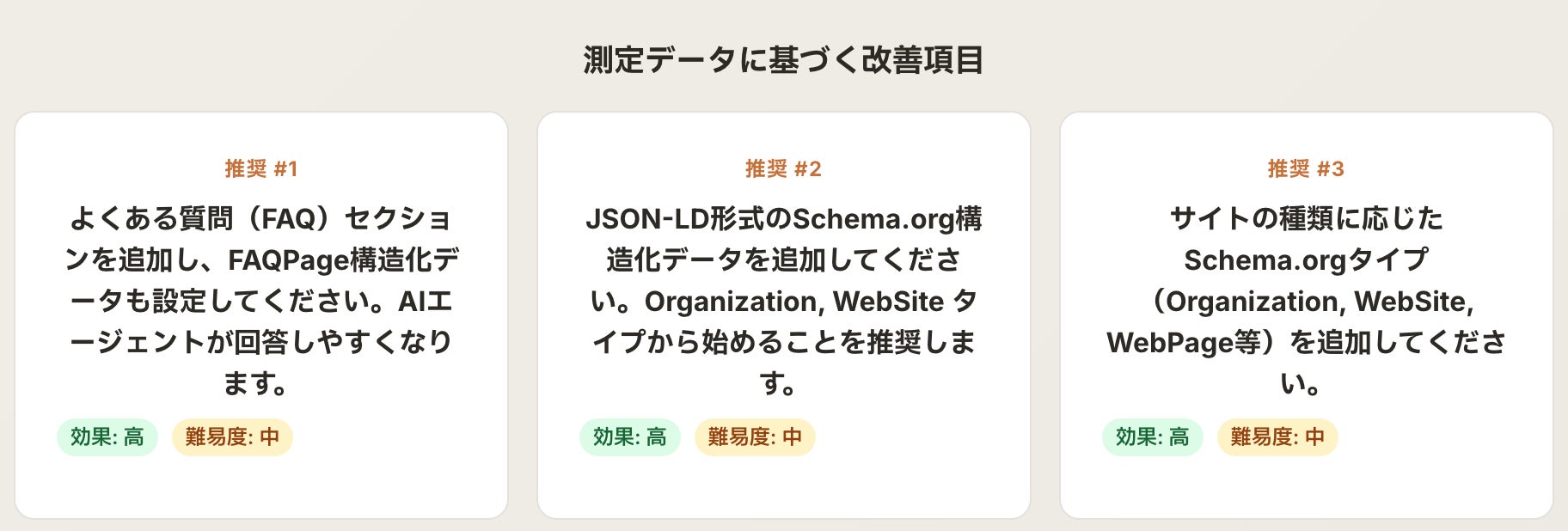 測定データに基づく改善項目 — 「llms.txtファイルの作成」「Organization Schemaの追加」など、各改善項目に準拠規格・改善見込み点数・実装難易度を明記。AI(主にAnthropic Claude Sonnet 4を使用)が5〜7件を抽出