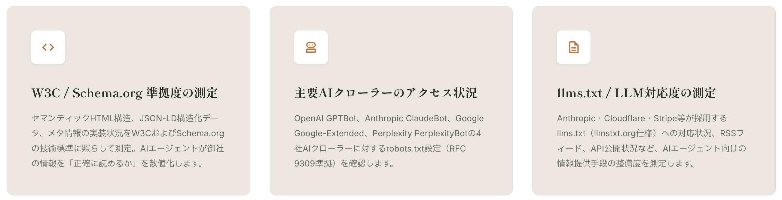 しかし、現時点で自社サイトがAIエージェントからどう見えているかを客観的に評価する手段は、日本語環境においてほぼ存在しませんでした。本ツールは、この課題を解決するために開発されました。