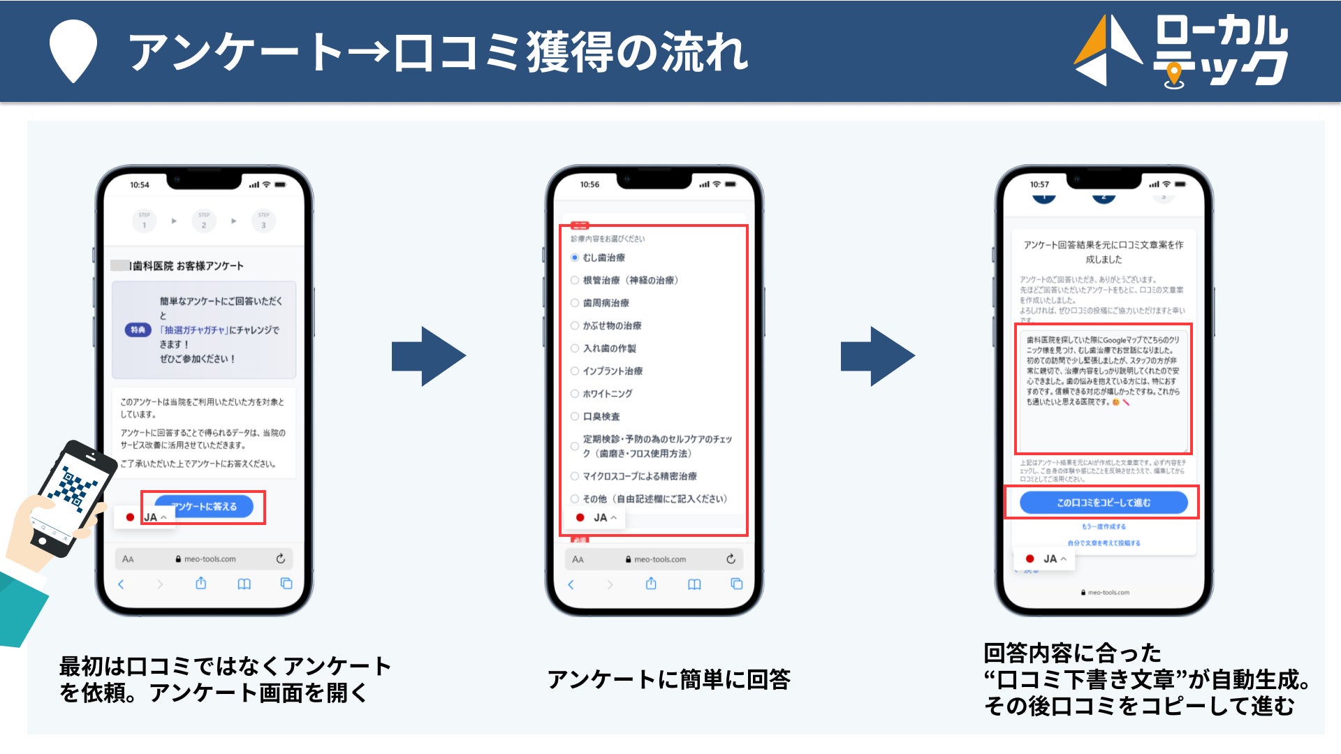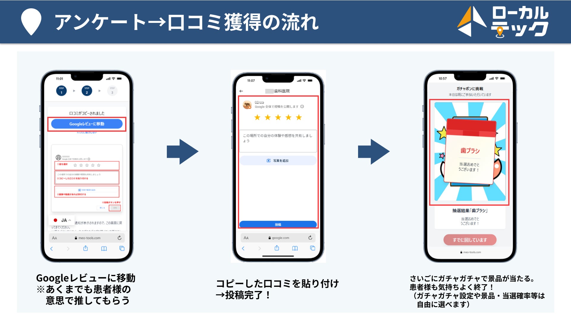 同院では、この仕組みを取り入れたことで、口コミ依頼に対するスタッフの抵抗感が軽減され、継続的な運用が可能になったといいます。Googleや景品表示法のガイドラインにも遵守しているので、安心してご利用いただけます。
