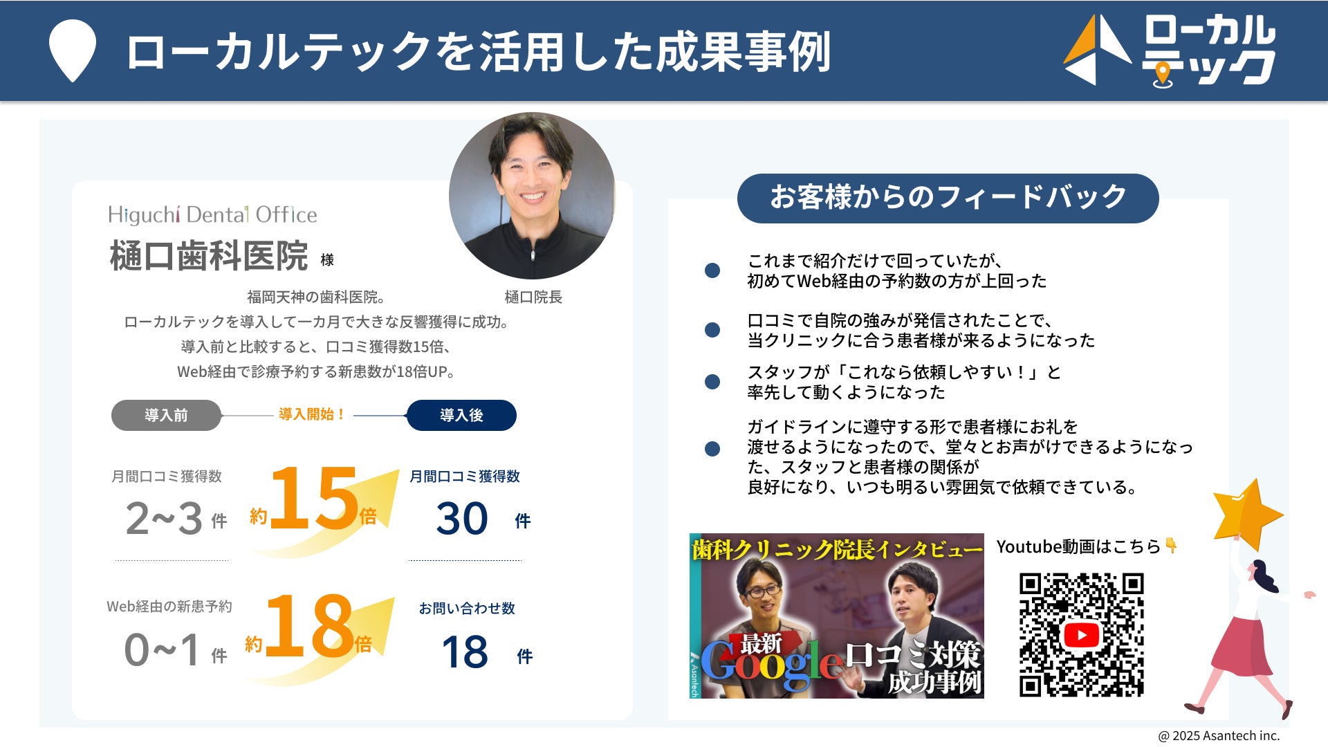 Googleマップの口コミ支援・MEO対策サービスを提供するAsantech株式会社(本社:東京都台東区、代表取締役:高野光博)は、当社の口コミ獲得支援ツール「ローカルテック」を導入した樋口歯科医院(所在地:福岡市天神)から、導入後の運用成果をインタビューでお伺いしました。