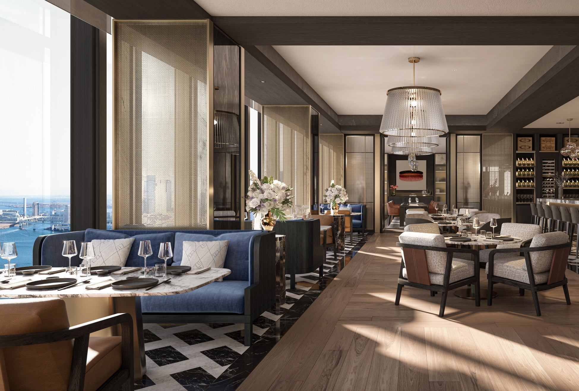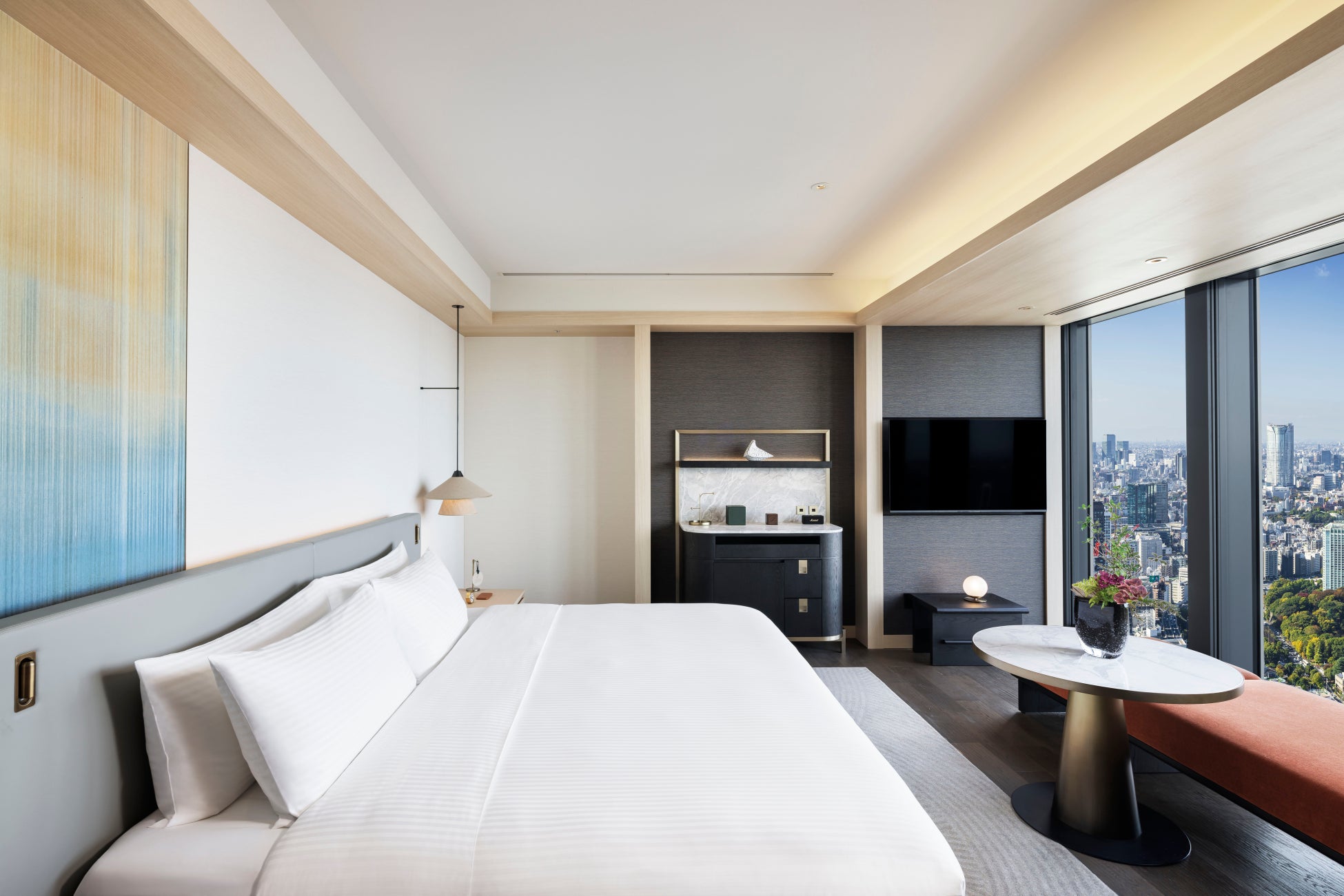 フェアモント東京は、西に東京タワー、東に東京湾を望む比類なき眺望と、洗練された贅沢な空間を提供します。インテリアデザインは、国際的に評価の高いデザインスタジオ「BAR Studio」が手がけ、都心のエネルギーと東京湾の静けさが調和する美を表現しています。館内は柔らかな色調と質感豊かな素材、洗練された照明デザインが都心の煌めきと水辺の静けさを引き立てます。さらに、織物や金継ぎなどの日本の伝統技法をモダンに解釈し、アートやテキスタイルに取り入れ、匠の技への深い敬意を表現。館内全体に配されたアートは「この地に継承する、必然の重なり」をコンセプトに、芝浦の地で過去と現在が交錯し続け、深く根付いた美意識を抽象的に表現しています。