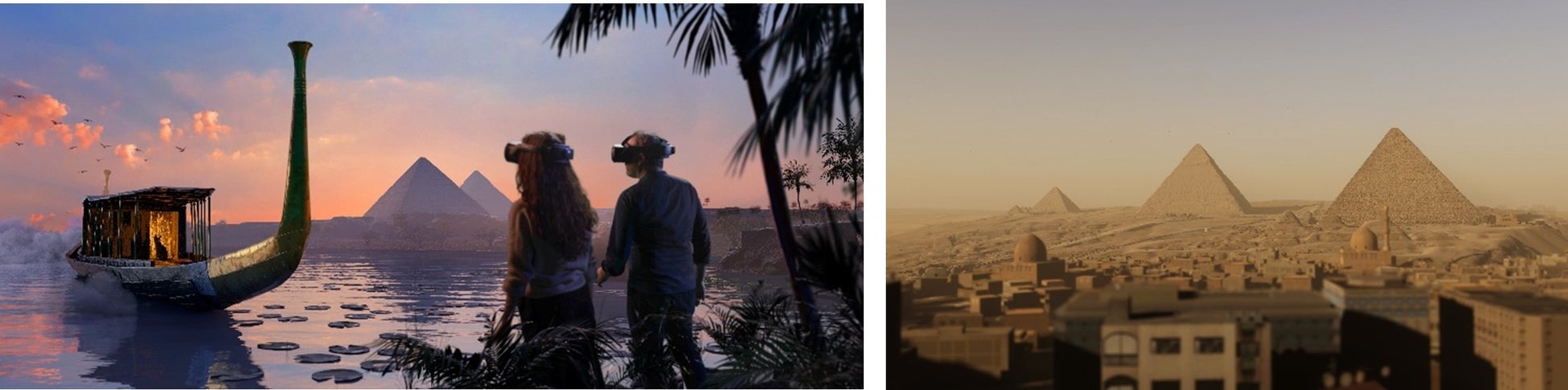 開館第1弾作品となる「Horizon of Khufu」は、4500年前の古代エジプトを舞台にしたクフ王とピラミッドにまつわる作品です。時空の制約から解放された冒険者たちは、ピラミッドの頂上からギザ、カイロを望み、「太陽の船」でナイル川を航行、ピラミッド内を探検し、4500年前の古代エジプト人の神聖な儀式にたどり着きます。