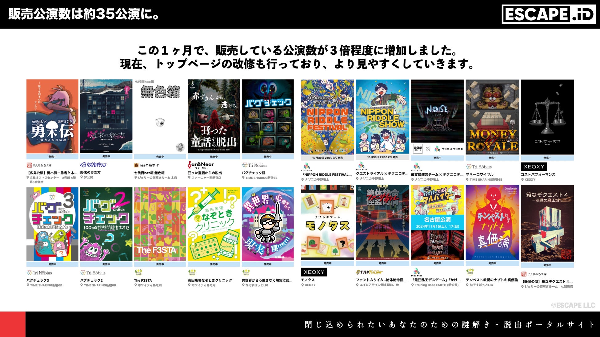 ESCAPE合同会社(所在地:東京都品川区、統括プロデューサー 佐々木 翼)の運営する謎解き・脱出ゲームに特化したチケットポータルサイト「ESCAPE.ID」に、新たに17の団体が加盟しました。これにより、総加盟団体数は24団体となり、全国規模のチケットサイトとなりました。