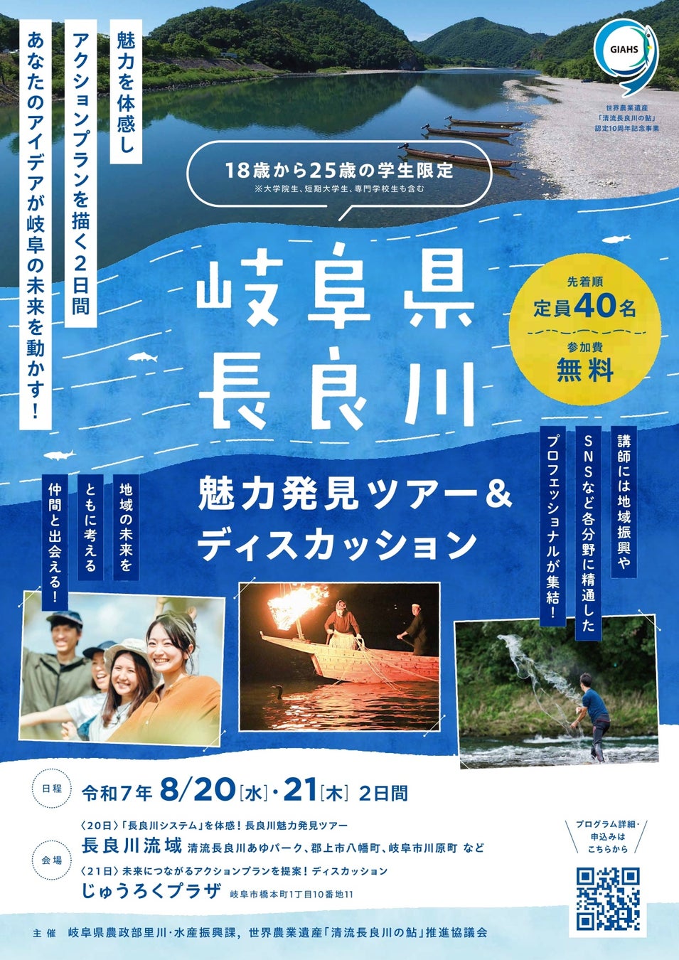 岐阜県及び世界農業遺産「清流長良川の鮎」推進協議会では、本年度、世界農業遺産認定から10年を迎えることから、この節目を絶好の機会ととらえ「若者の発信力」を活用して、世界農業遺産の価値を伝えていくこととしています。