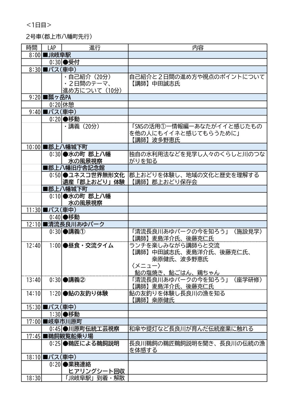 長良川魅力発見ツアー ・現地にて、現場の声や実践者の活動等を学び、テーマ解決に向けた問題点・課題等を考察 |