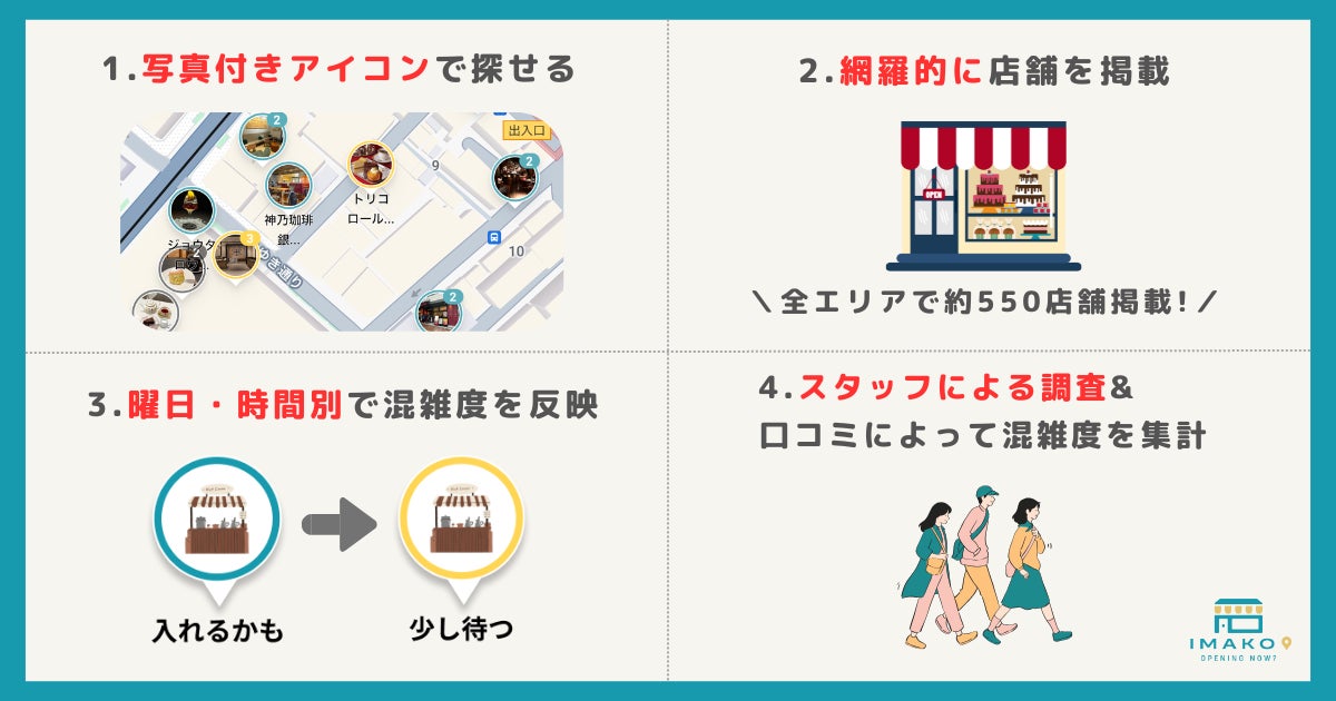 「imako」では地図上からカフェの混雑度を表示することで、今いる場所から一番近い場所で入れるカフェを見つけることが可能になります。