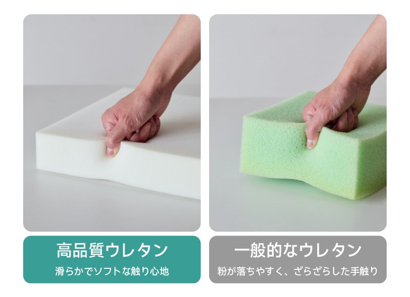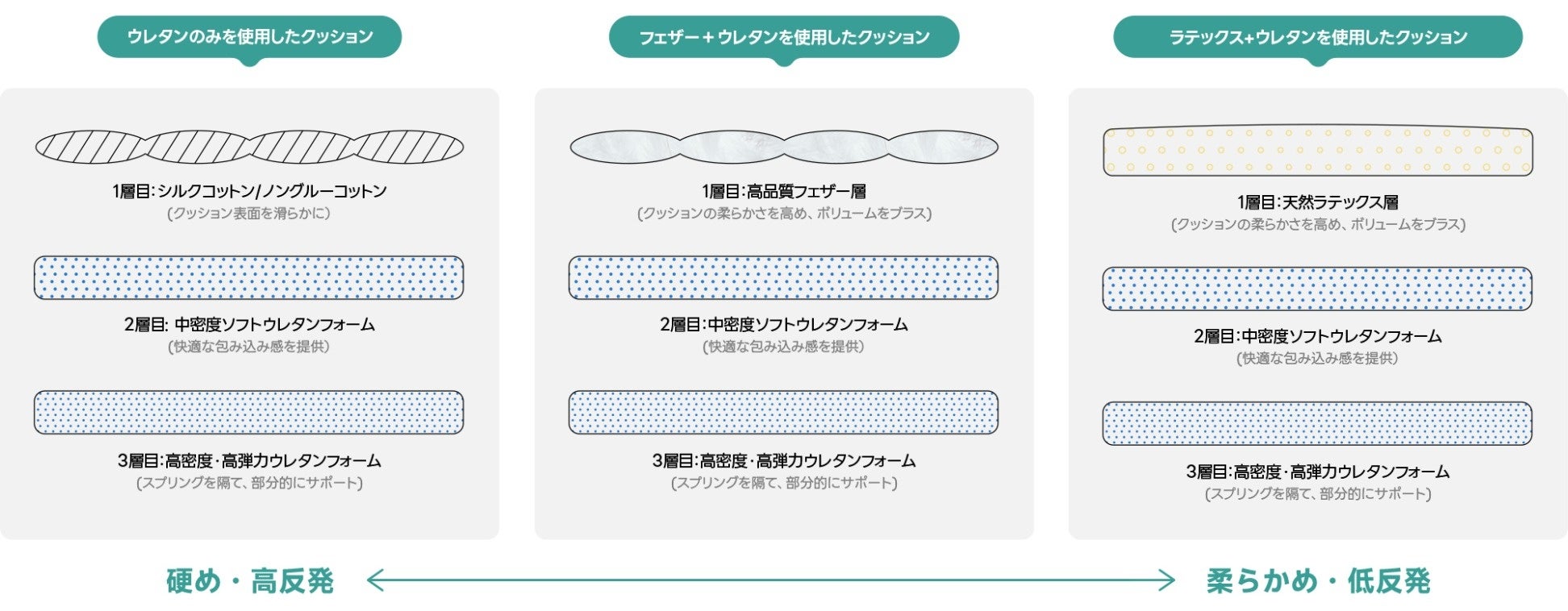 「ウレタンのみ」、「フェザー+ウレタン」、「ラテックス+ウレタン」の3種類の充填方法を採用し、ふわふわしたソフトな座り心地がお好みの方にも、反発力が高いしなやかな座り心地がお好みな方にも、お好きな方をお選びいただけます!