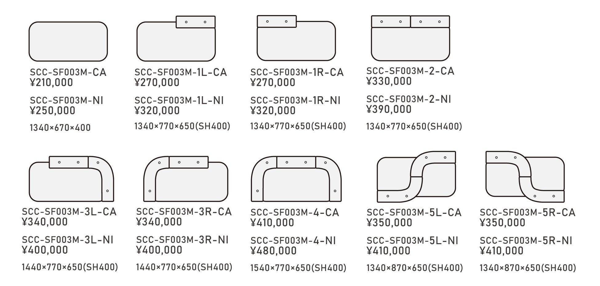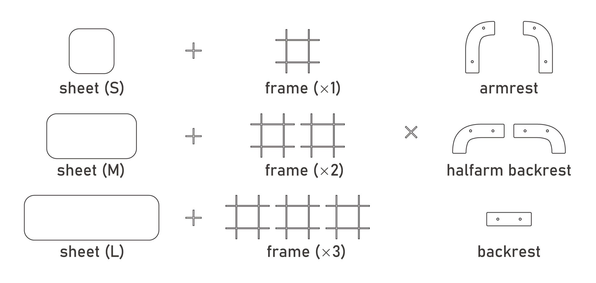 3サイズのシートベースを基本とし、アームレストやバックレストの組み合わせの中からご希望の型番をセレクト。空間に合わせたオリジナルソファを自由にレイアウトしましょう。
