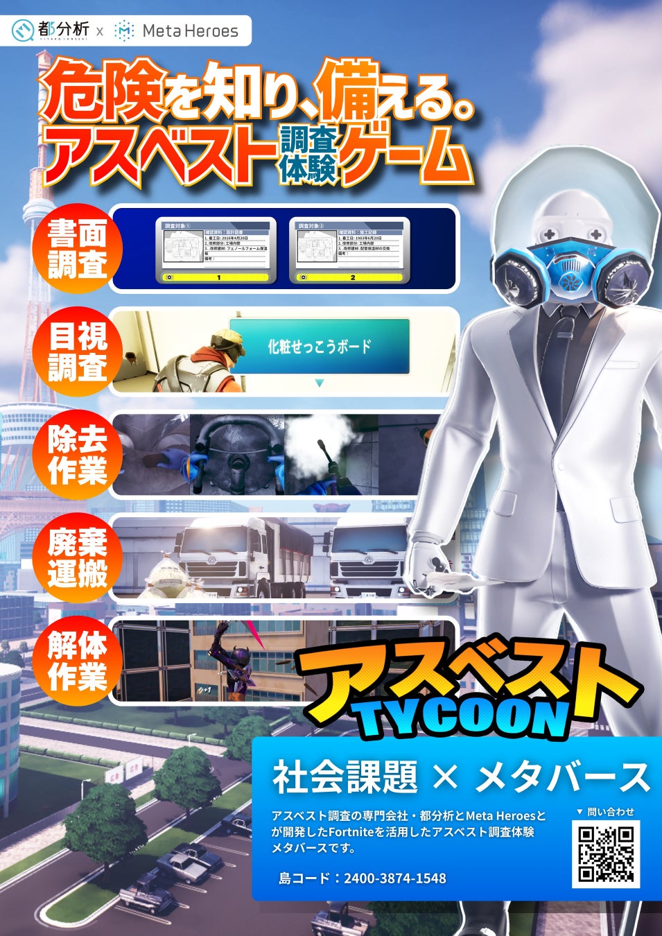 アスベスト分析会社の株式会社都分析と株式会社Meta Heroesが提携し、Fortnite上に「アスベスト調査から解体(竣工)まで」を誰でも楽しく学べる体験型教育メタバースゲームをリリース!