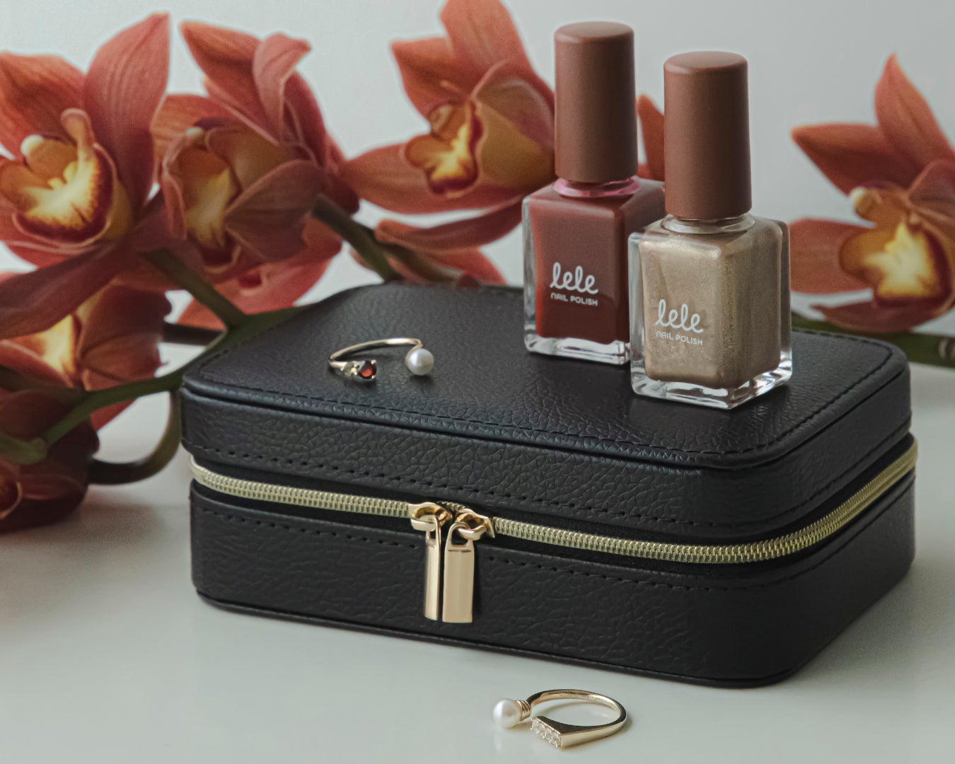 lele 2025 Holiday 新色2種と、田久保夏鈴さんコラボレーションリング2種を、シックなブラックのジュエリーボックスにセット。
